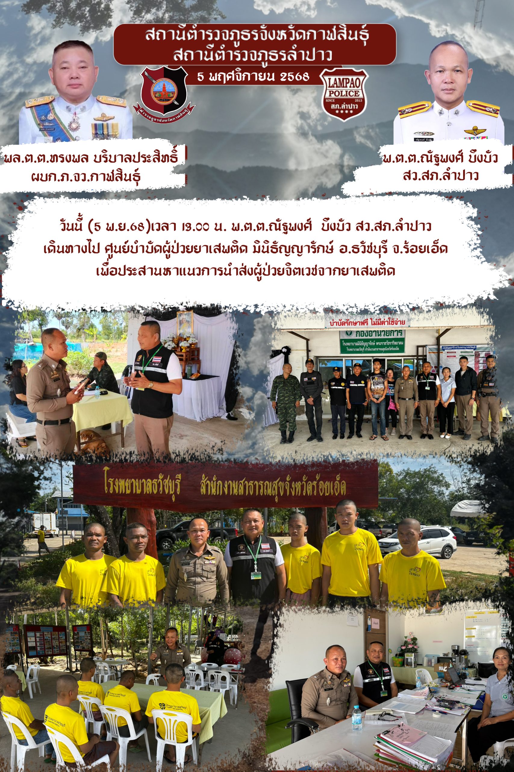 วันนี้ (5 พ.ย. 2568 เวลา 13.00 น.) พ.ต.ต.ณัฐพงศ์ บึงบัว สว.สภ.ลำปาว เดินทางไปศูนย์บำบัดผู้ป่วยยาเสพ