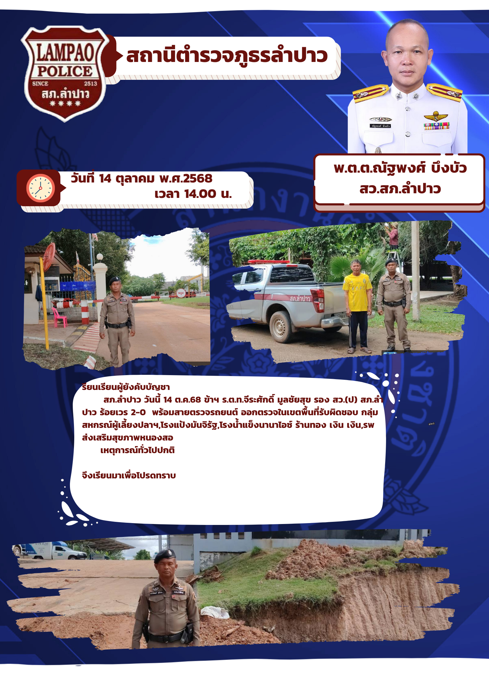 รียนเรียนผู้ยังคับบัญชา สภ.ลำปาว วันนี้ 14 ต.ค.68 ข้าฯ ร.ต.ท.จีระศักดิ์ มูลชัยสุข รอง สว.(ป) สภ.ลำปา