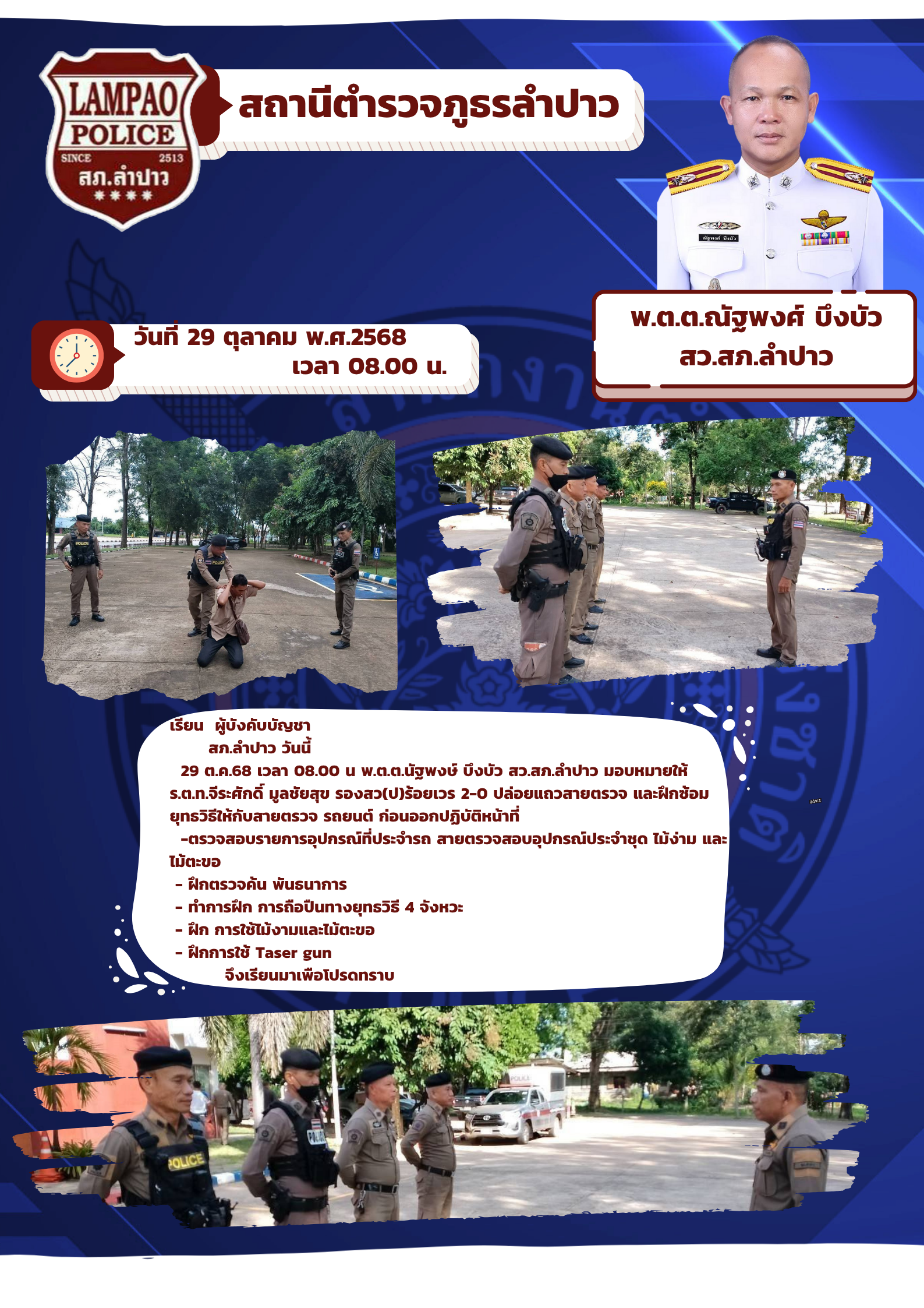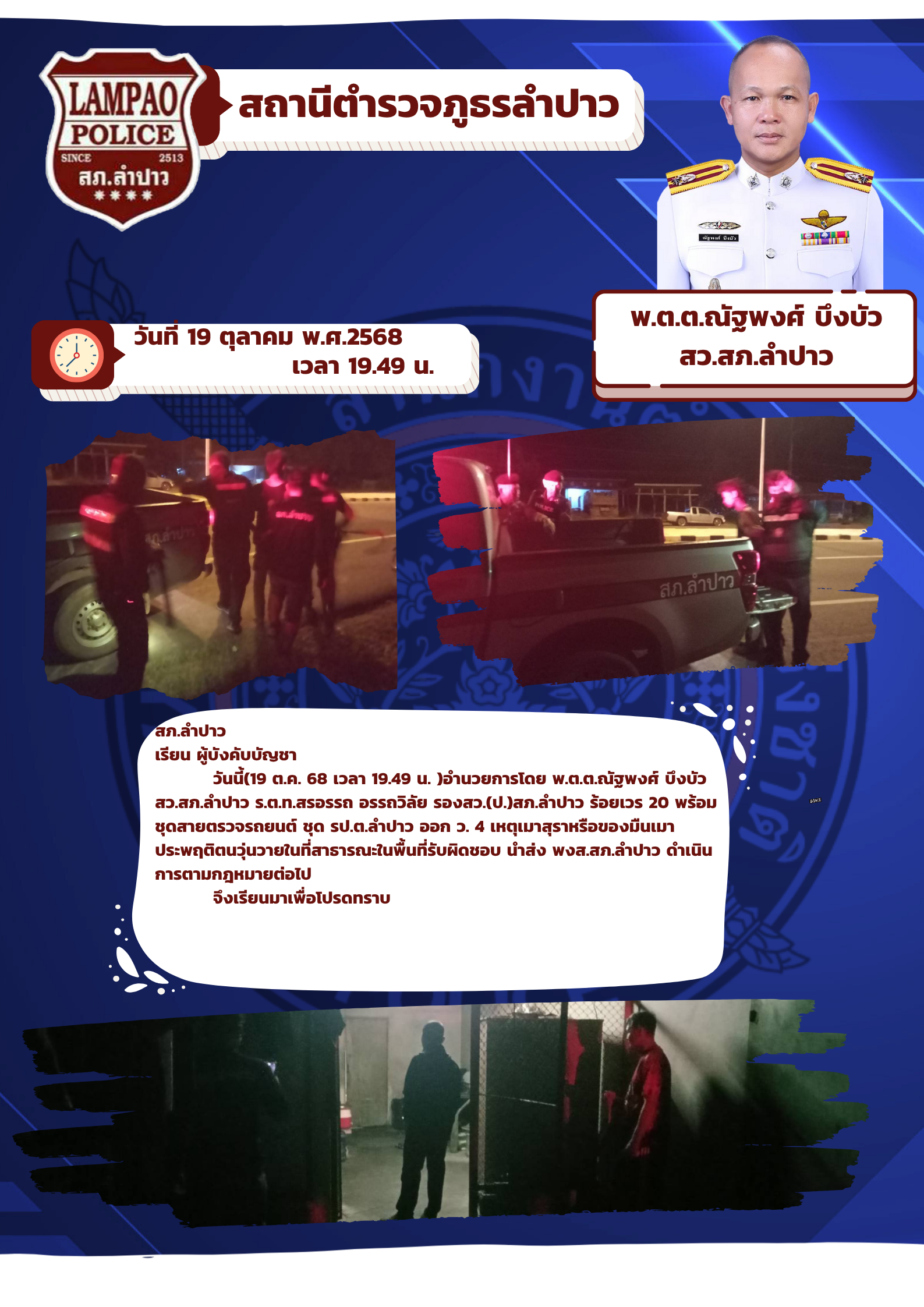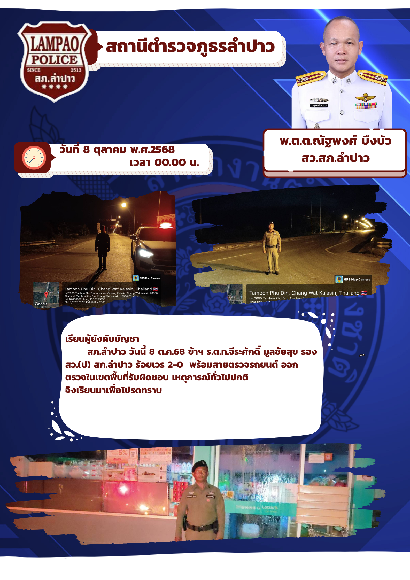 สภ.ลำปาว เรียน ผู้บังคับบัญชา วันนี้(19 ต.ค. 68 เวลา 19.49 น. )อำนวยการโดย พ.ต.ต.ณัฐพงศ์ บึงบัว สว.ส