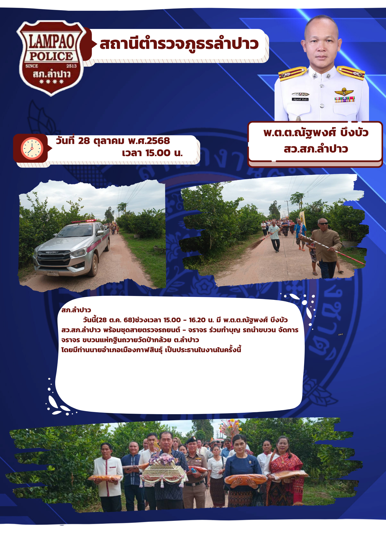 สภ.ลำปาว วันนี้(28 ต.ค. 68)ช่วงเวลา 15.00 – 16.20 น. มี พ.ต.ต.ณัฐพงศ์ บึงบัว สว.สภ.ลำปาว พร้อม