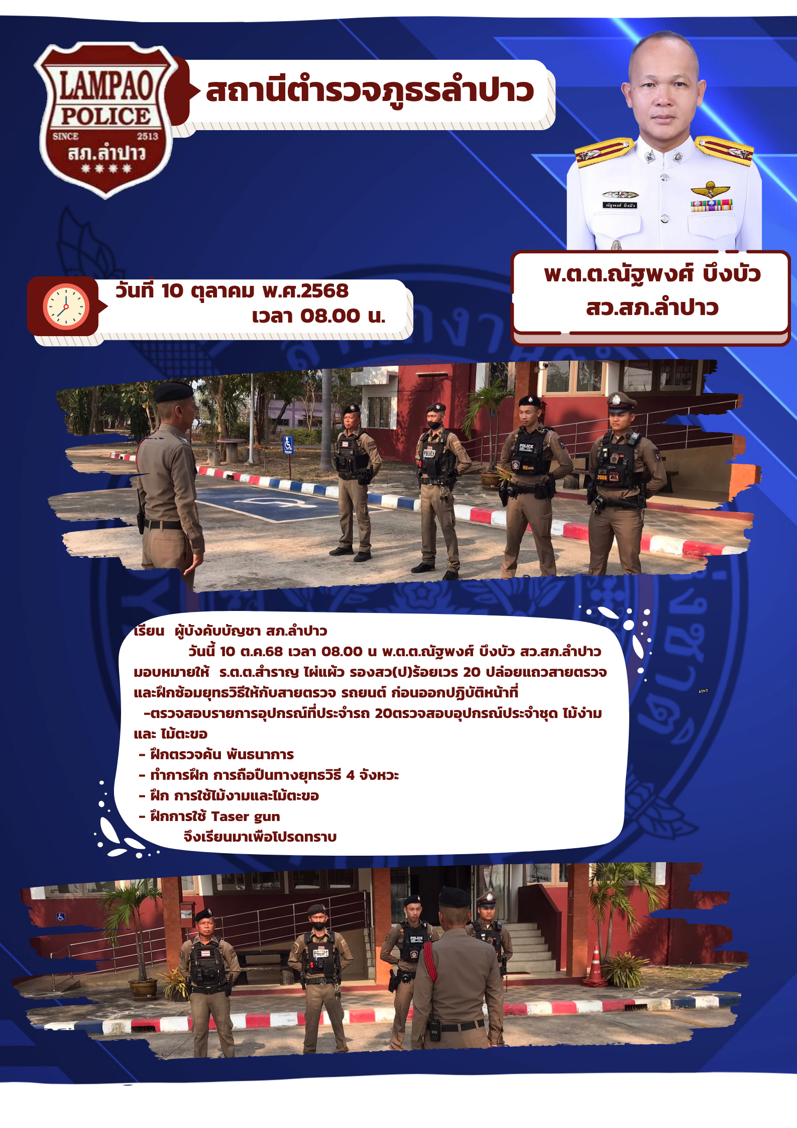 เรียน ผู้บังคับบัญชา สภ.ลำปาว วันนี้ 10 ต.ค.68 ข้าฯ ร.ต.ต.สำราญ ไผ่แผ้ว รอง สว.(ป.)ฯ ร้อยเวร 20 R