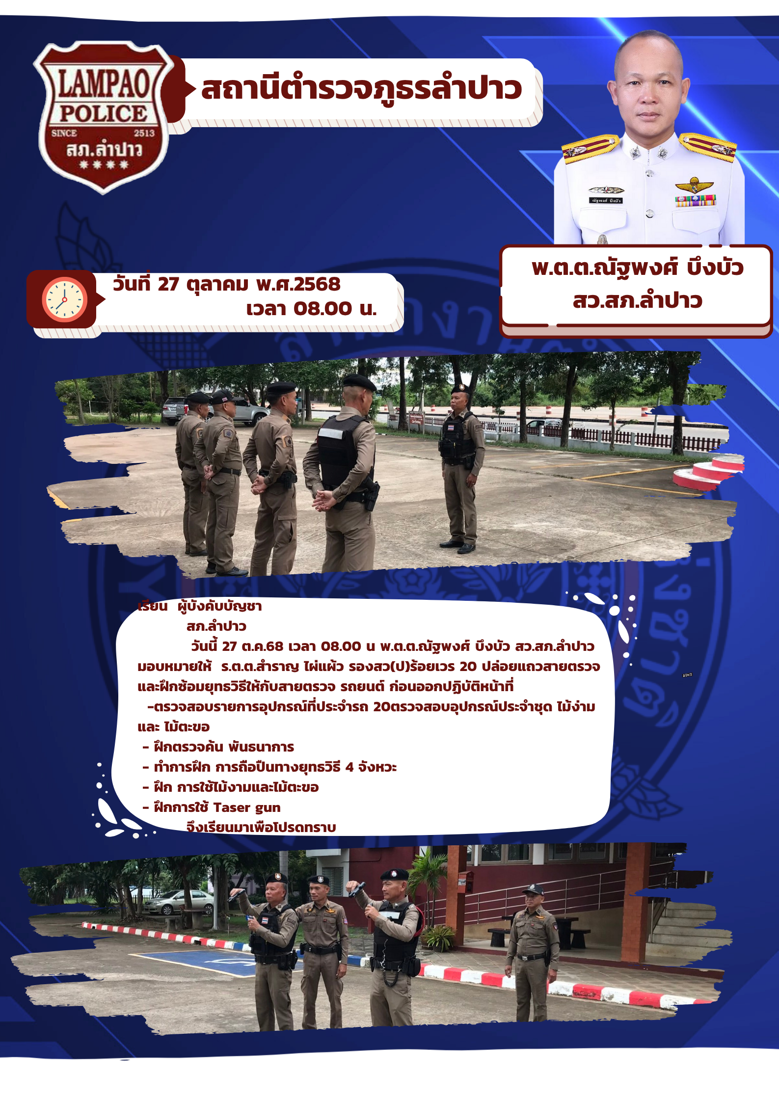 เรียน ผู้บังคับบัญชา สภ.ลำปาว วันนี้ 27 ต.ค.68 เวลา 08.00 น พ.ต.ต.ณัฐพงศ์ บึงบัว สว.สภ.ลำปาว มอบหมาย