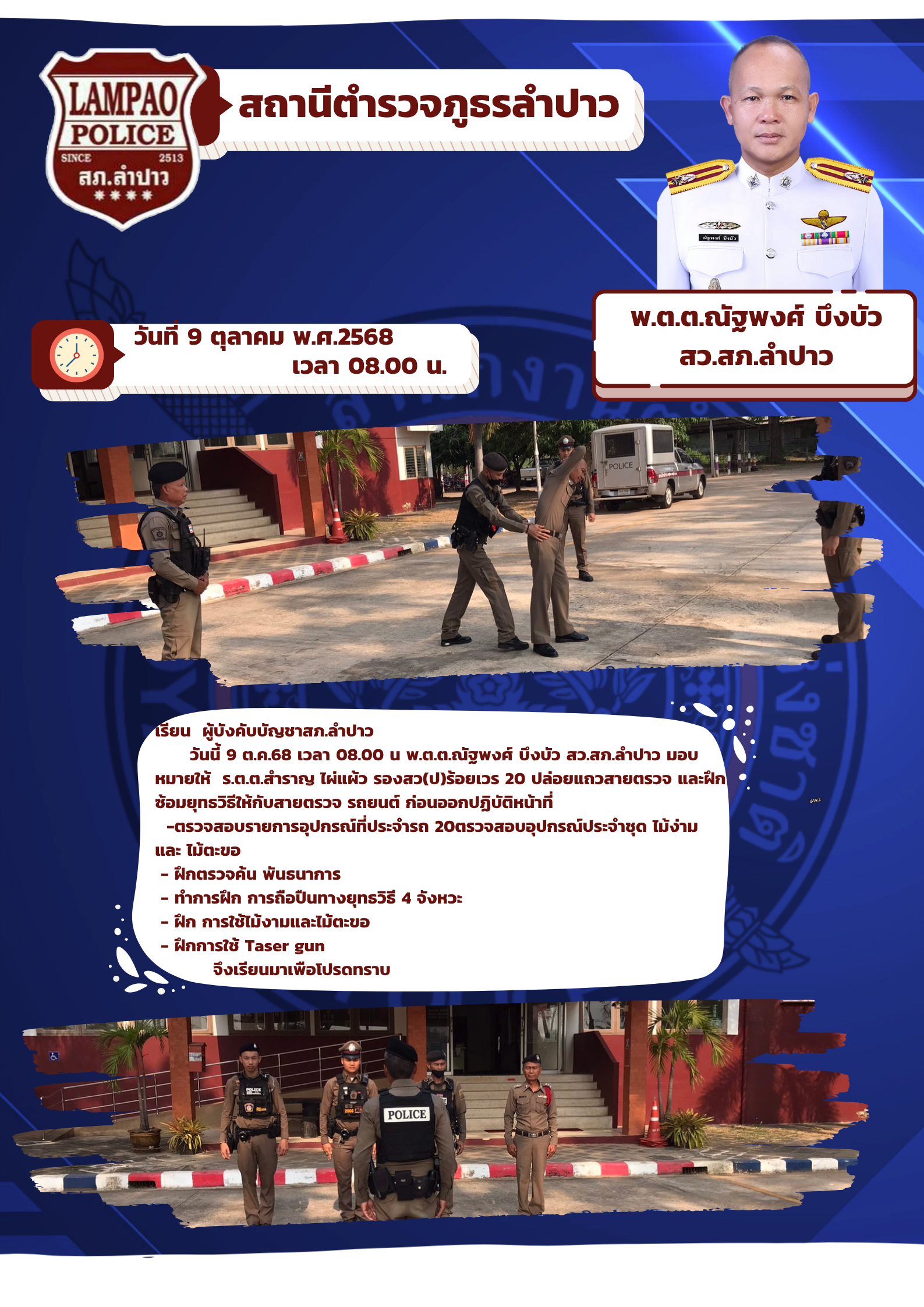 รียน ผู้บังคับบัญชา สภ.ลำปาว วันนี้ 30 ต.ค.68 เวลา 08.00 น พ.ต.ต.ณัฐพงศ์ บึงบัว สว.สภ.ลำปาว มอบหมายใ