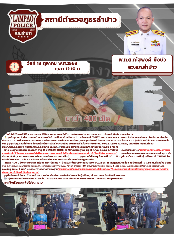 👮 ชุดจับกุม สภ.ลำปาว ประกอบด้วย..ร.ต.อ.อนันท์ ฤทธิ์สิงห์ เจ้าพนักงาน ป.ป.ส.บัตรเลขที่ 6601871 รอง สว.สส รอง สว.สส.สภ.ลำปาว,ร.ต.อ.คำแผง เพ็ญประชุม เจ้าพนักนักงาน ป.ป.ส.เลขที่ 670693 รอง สว.กก.สส.ช่วยราชการ งานสืบสวน สภ.ลำปาว,ร.ต.ท.พุทธลักษณ์ อินปาว รอง สว.(ป.) สภ.ลำปาว, ร.ต.ต.รุ่งศิลป์. ยลวิชัย รอง สว.(ป.)สภ.ลำปาว