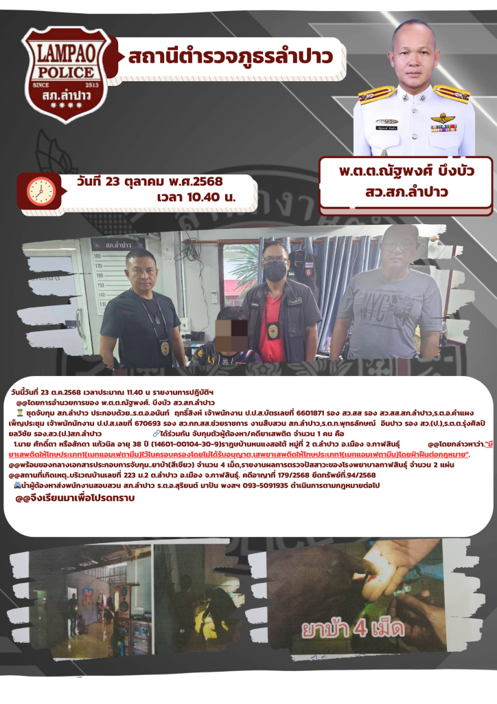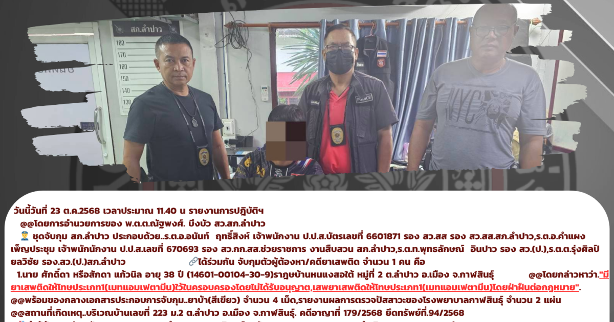 👮 ชุดจับกุม สภ.ลำปาว ประกอบด้วย..ร.ต.อ.อนันท์ ฤทธิ์สิงห์ เจ้าพนักงาน ป.ป.ส.บัตรเลขที่ 6601871 รอง สว.สส รอง สว.สส.สภ.ลำปาว,ร.ต.อ.คำแผง เพ็ญประชุม เจ้าพนักนักงาน ป.ป.ส.เลขที่ 670693 รอง สว.กก.สส.ช่วยราชการ งานสืบสวน สภ.ลำปาว,ร.ต.ท.พุทธลักษณ์ อินปาว รอง สว.(ป.),ร.ต.ต.รุ่งศิลป์ ยลวิชัย รอง.สว.(ป.)สภ.ลำปาว 🔗ได้ร่วมกัน จับกุมตัวผู้ต้องหา/คดียาเสพติด จำนวน 1 คน คือ