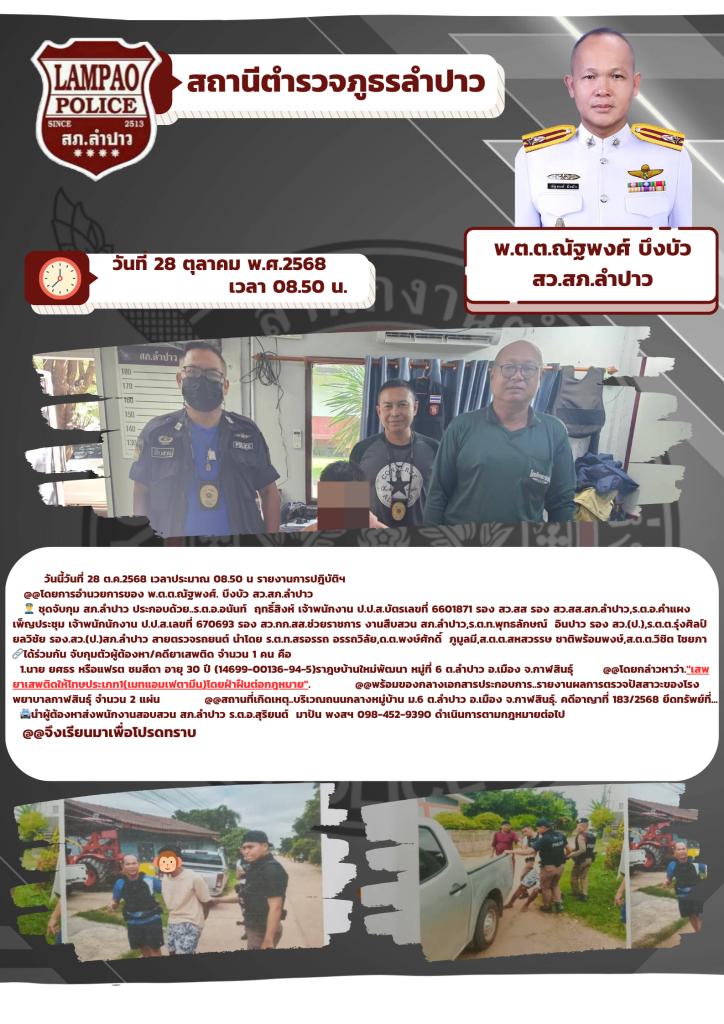 👮 ชุดจับกุม สภ.ลำปาว ประกอบด้วย..ร.ต.อ.อนันท์ ฤทธิ์สิงห์ เจ้าพนักงาน ป.ป.ส.บัตรเลขที่ 6601871 รอง สว.สส รอง สว.สส.สภ.ลำปาว,ร.ต.อ.คำแผง เพ็ญประชุม เจ้าพนักนักงาน ป.ป.ส.เลขที่ 670693 รอง สว.กก.สส.ช่วยราชการ งานสืบสวน สภ.ลำปาว,ร.ต.ท.พุทธลักษณ์ อินปาว รอง สว.(ป.),ร.ต.ต.รุ่งศิลป์ ยลวิชัย รอง.สว.(ป.)สภ.ลำปาว สายตรวจรถยนต์ นำโดย ร.ต.ท.สรอรรถ อรรถวิลัย,ด.ต.พงษ์ศักดิ์ ภูมูลมี,ส.ต.ต.สหสวรรษ ชาติพร้อมพงษ์,ส.ต.ต.วิชิต ไชยภา 🔗ได้ร่วมกัน จับกุมตัวผู้ต้องหา/คดียาเสพติด จำนวน 1 คน คือ
