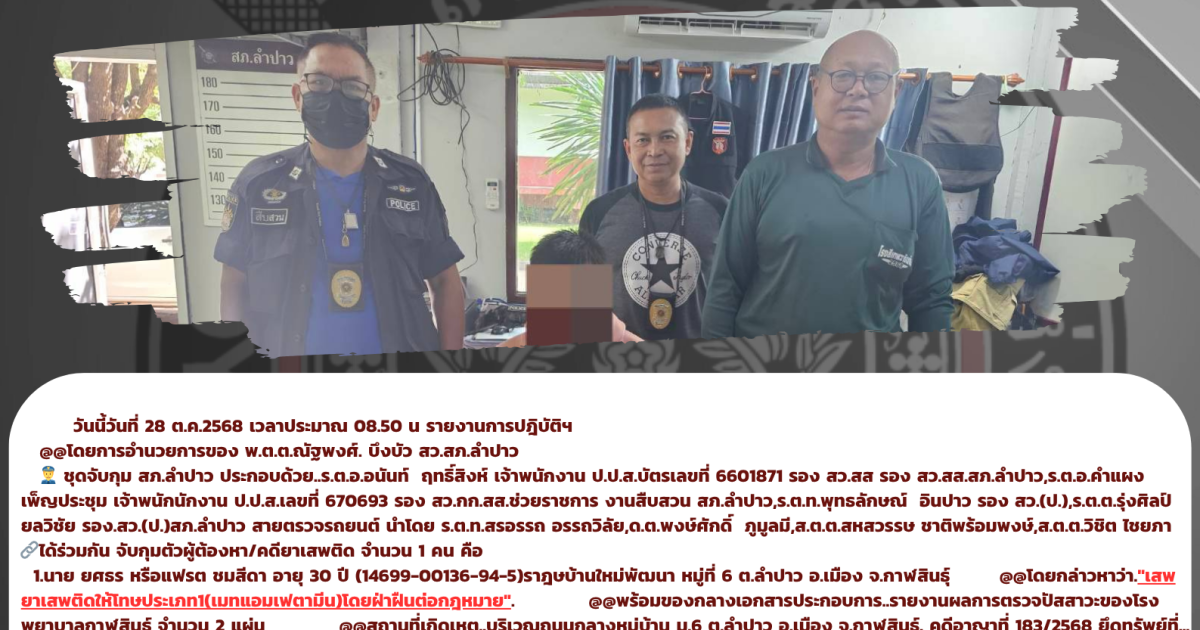 👮 ชุดจับกุม สภ.ลำปาว ประกอบด้วย..ร.ต.อ.อนันท์ ฤทธิ์สิงห์ เจ้าพนักงาน ป.ป.ส.บัตรเลขที่ 6601871 รอง สว.สส รอง สว.สส.สภ.ลำปาว,ร.ต.อ.คำแผง เพ็ญประชุม เจ้าพนักนักงาน ป.ป.ส.เลขที่ 670693 รอง สว.กก.สส.ช่วยราชการ งานสืบสวน สภ.ลำปาว,ร.ต.ท.พุทธลักษณ์ อินปาว รอง สว.(ป.),ร.ต.ต.รุ่งศิลป์ ยลวิชัย รอง.สว.(ป.)สภ.ลำปาว สายตรวจรถยนต์ นำโดย ร.ต.ท.สรอรรถ อรรถวิลัย,ด.ต.พงษ์ศักดิ์ ภูมูลมี,ส.ต.ต.สหสวรรษ ชาติพร้อมพงษ์,ส.ต.ต.วิชิต ไชยภา 🔗ได้ร่วมกัน จับกุมตัวผู้ต้องหา/คดียาเสพติด จำนวน 1 คน คือ