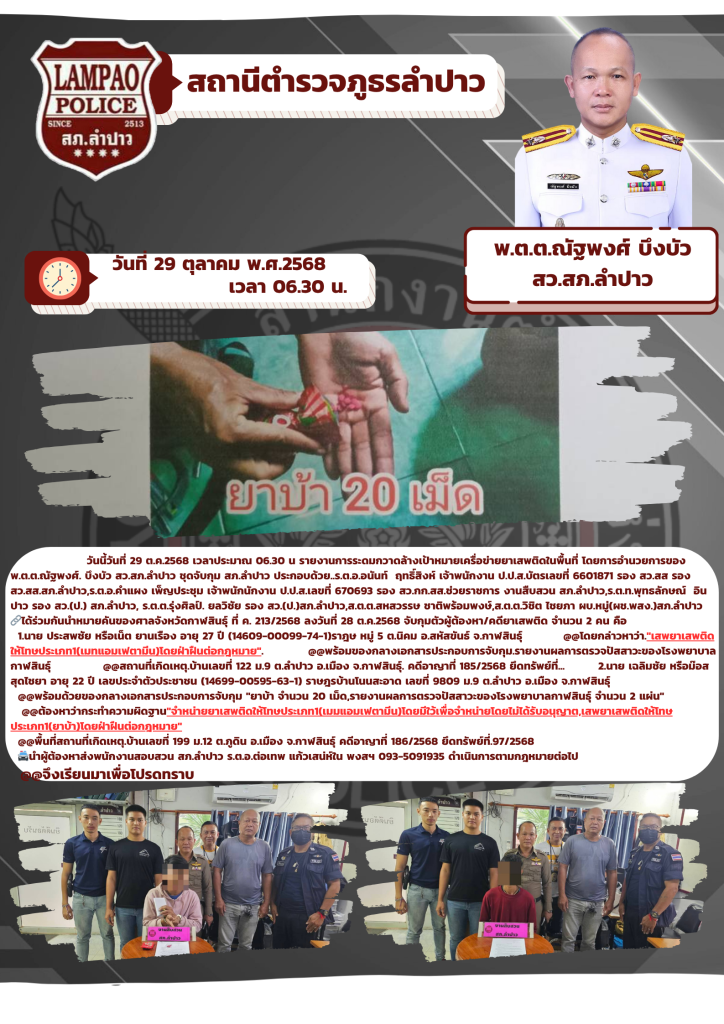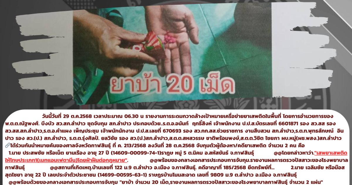 👮 ชุดจับกุม สภ.ลำปาว ประกอบด้วย..ร.ต.อ.อนันท์ ฤทธิ์สิงห์ เจ้าพนักงาน ป.ป.ส.บัตรเลขที่ 6601871 รอง สว.สส รอง สว.สส.สภ.ลำปาว,ร.ต.อ.คำแผง เพ็ญประชุม เจ้าพนักนักงาน ป.ป.ส.เลขที่ 670693 รอง สว.กก.สส.ช่วยราชการ งานสืบสวน สภ.ลำปาว,ร.ต.ท.พุทธลักษณ์ อินปาว รอง สว.(ป.) สภ.ลำปาว, ร.ต.ต.รุ่งศิลป์. ยลวิชัย รอง สว.(ป.)สภ.ลำปาว,ส.ต.ต.สหสวรรษ ชาติพร้อมพงษ์,ส.ต.ต.วิชิต ไชยภา ผบ.หมู่(ผช.พสง.)สภ.ลำปาว 🔗ได้ร่วมกันนำหมายคันของศาลจังหวัดกาฬสินธุ์ ที่ ค. 213/2568 ลงวันที่ 28 ต.ค.2568 จับกุมตัวผู้ต้องหา/คดียาเสพติด จำนวน 2 คน คือ