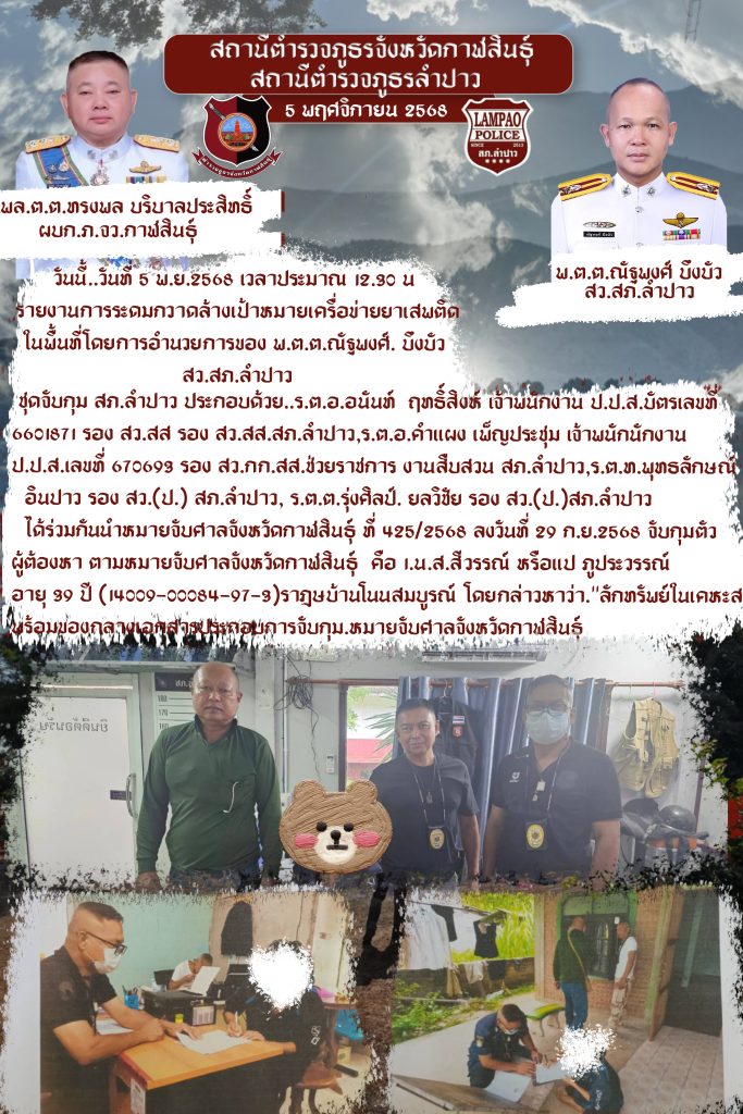 👮 ชุดจับกุม สภ.ลำปาว ประกอบด้วย..ร.ต.อ.อนันท์ ฤทธิ์สิงห์ เจ้าพนักงาน ป.ป.ส.บัตรเลขที่ 6601871 รอง สว.สส รอง สว.สส.สภ.ลำปาว,ร.ต.อ.คำแผง เพ็ญประชุม เจ้าพนักนักงาน ป.ป.ส.เลขที่ 670693 รอง สว.กก.สส.ช่วยราชการ งานสืบสวน สภ.ลำปาว,ร.ต.ท.พุทธลักษณ์ อินปาว รอง สว.(ป.) สภ.ลำปาว, ร.ต.ต.รุ่งศิลป์. ยลวิชัย รอง สว.(ป.)สภ.ลำปาว 🔗ได้ร่วมกันนำหมายจับศาลจังหวัดกาฬสินธุ์ ที่ 425/2568 ลงวันที่ 29 ก.ย.2568 จับกุมตัวผู้ต้องหา ตามหมายจับศาลจังหวัดกาฬสินธุ์ คือ