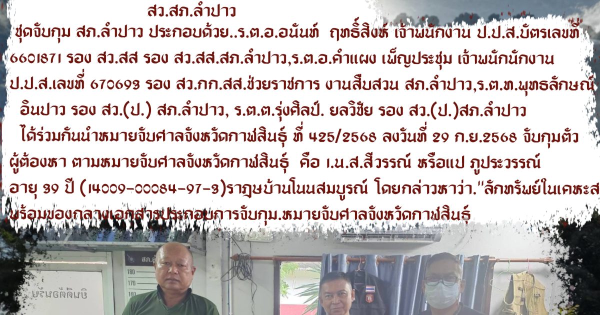 👮 ชุดจับกุม สภ.ลำปาว ประกอบด้วย..ร.ต.อ.อนันท์ ฤทธิ์สิงห์ เจ้าพนักงาน ป.ป.ส.บัตรเลขที่ 6601871 รอง สว.สส รอง สว.สส.สภ.ลำปาว,ร.ต.อ.คำแผง เพ็ญประชุม เจ้าพนักนักงาน ป.ป.ส.เลขที่ 670693 รอง สว.กก.สส.ช่วยราชการ งานสืบสวน สภ.ลำปาว,ร.ต.ท.พุทธลักษณ์ อินปาว รอง สว.(ป.) สภ.ลำปาว, ร.ต.ต.รุ่งศิลป์. ยลวิชัย รอง สว.(ป.)สภ.ลำปาว 🔗ได้ร่วมกันนำหมายจับศาลจังหวัดกาฬสินธุ์ ที่ 425/2568 ลงวันที่ 29 ก.ย.2568 จับกุมตัวผู้ต้องหา ตามหมายจับศาลจังหวัดกาฬสินธุ์ คือ