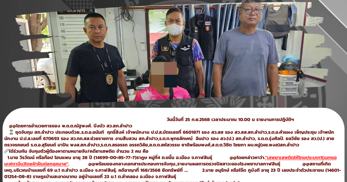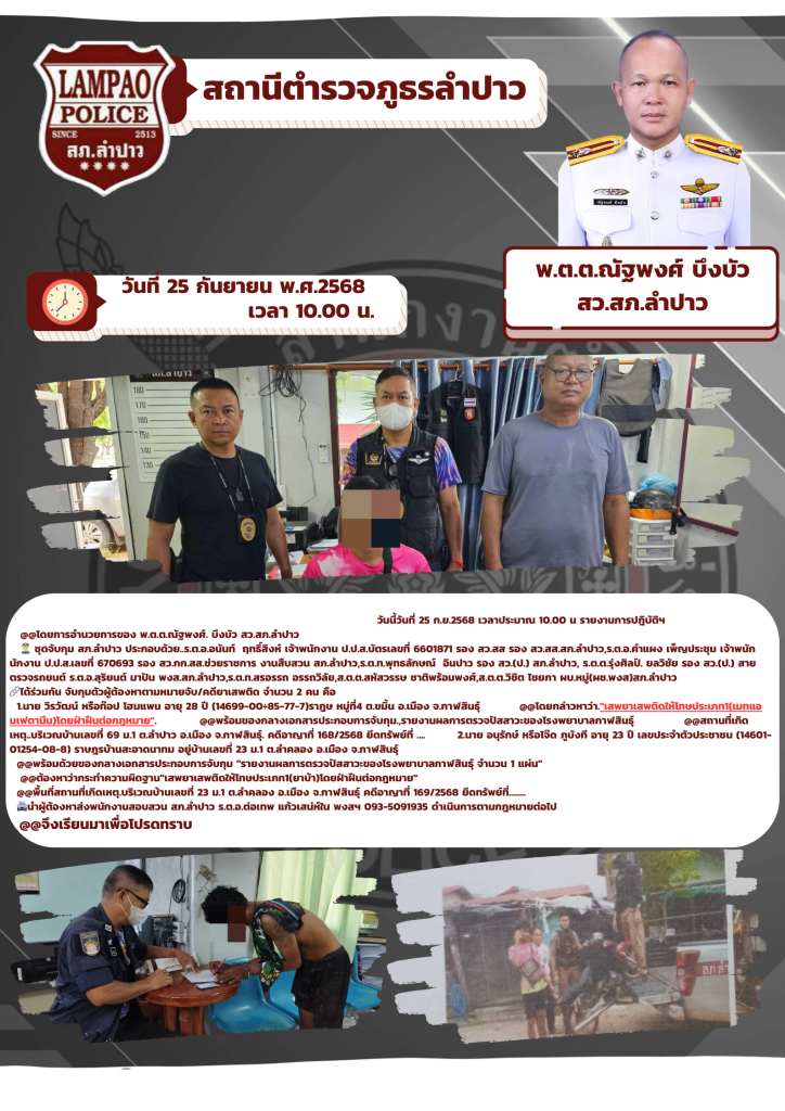 👮 ชุดจับกุม สภ.ลำปาว ประกอบด้วย..ร.ต.อ.อนันท์ ฤทธิ์สิงห์ เจ้าพนักงาน ป.ป.ส.บัตรเลขที่ 6601871 รอง สว.สส รอง สว.สส.สภ.ลำปาว,ร.ต.อ.คำแผง เพ็ญประชุม เจ้าพนักนักงาน ป.ป.ส.เลขที่ 670693 รอง สว.กก.สส.ช่วยราชการ งานสืบสวน สภ.ลำปาว,ร.ต.ท.พุทธลักษณ์ อินปาว รอง สว.(ป.) สภ.ลำปาว, ร.ต.ต.รุ่งศิลป์. ยลวิชัย รอง สว.(ป.) สายตรวจรถยนต์ ร.ต.อ.สุริยนต์ มาปัน พงส.สภ.ลำปาว,ร.ต.ท.สรอรรถ อรรถวิลัย,ส.ต.ต.สหัสวรรษ ชาติพร้อมพงศ์,ส.ต.ต.วิชิต ไชยภา ผบ.หมู่(ผช.พงส)สภ.ลำปาว 🔗ได้ร่วมกัน จับกุมตัวผู้ต้องหาตามหมายจับ/คดียาเสพติด จำนวน 2 คน คือ