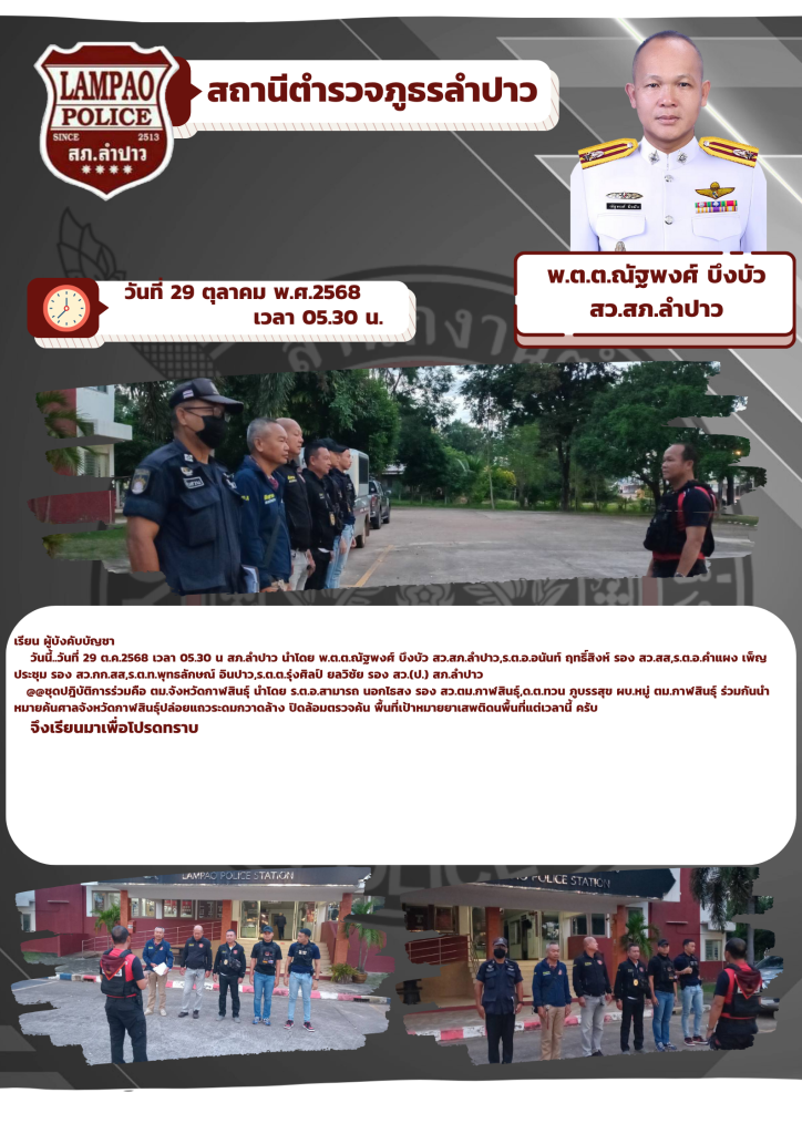 วันนี้..วันที่ 29 ต.ค.2568 เวลา 05.30 น สภ.ลำปาว นำโดย พ.ต.ต.ณัฐพงศ์ บึงบัว สว.สภ.ลำปาว,ร.ต.อ.อนันท์ ฤทธิ์สิงห์ รอง สว.สส,ร.ต.อ.คำแผง เพ็ญประชุม รอง สว.กก.สส,ร.ต.ท.พุทธลักษณ์ อินปาว,ร.ต.ต.รุ่งศิลป์ ยลวิชัย รอง สว.(ป.) สภ.ลำปาว