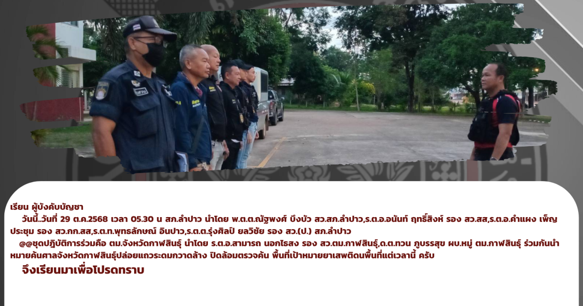 วันนี้..วันที่ 29 ต.ค.2568 เวลา 05.30 น สภ.ลำปาว นำโดย พ.ต.ต.ณัฐพงศ์ บึงบัว สว.สภ.ลำปาว,ร.ต.อ.อนันท์ ฤทธิ์สิงห์ รอง สว.สส,ร.ต.อ.คำแผง เพ็ญประชุม รอง สว.กก.สส,ร.ต.ท.พุทธลักษณ์ อินปาว,ร.ต.ต.รุ่งศิลป์ ยลวิชัย รอง สว.(ป.) สภ.ลำปาว