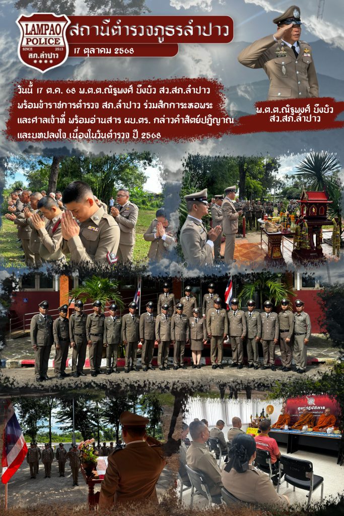 วันนี้ 17 ต.ค. 68 พ.ต.ต.ณัฐพงศ์ บึงบัว สว.สภ.ลำปาว พร้อมข้าราชการตำรวจ สภ.ลำปาว ร่วมสักการะหอพระ และศาลเจ้าที่ พร้อมอ่านสาร ผบ.ตร. กล่าวคำสัตย์ปฏิญาณ และบทปลงใจ เนื่องในวันตำรวจ ปี 2568