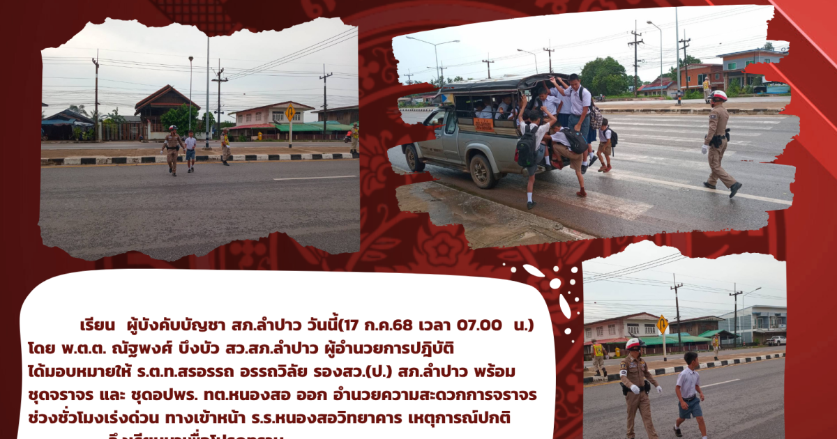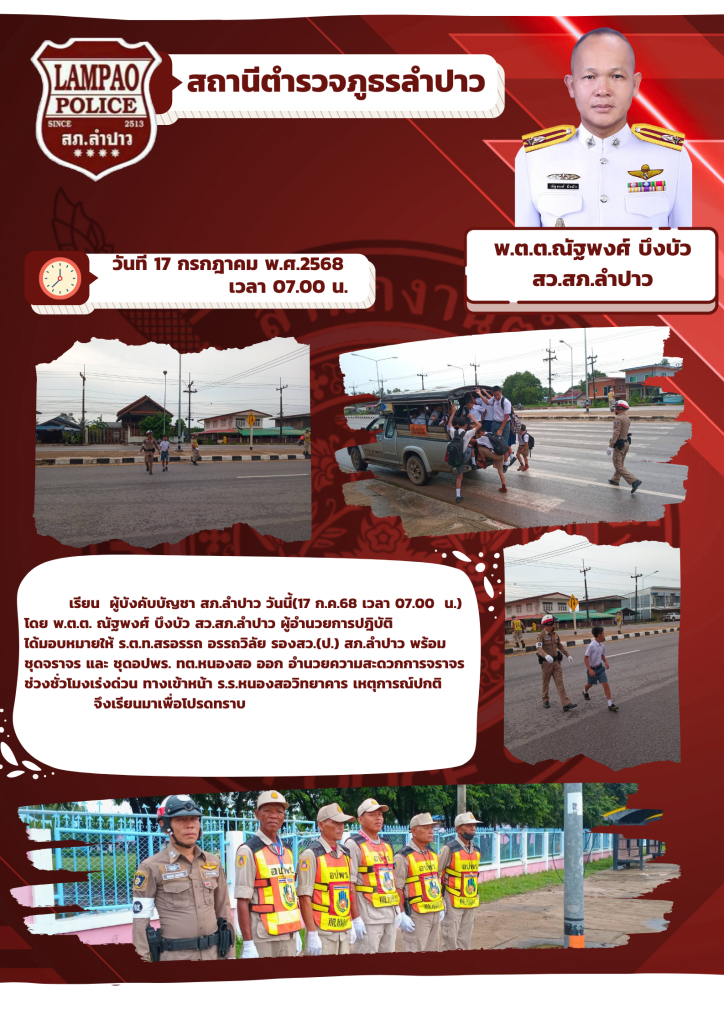 วันที่ 17 กรกฎาคม พ.ศ.2568 17 กรกฎาคม 2568 โดย admlumpao / งานจราจร สภ.ลำปาว วันนี้(17 ก.ค.68 เวลา 07.00 น.) โดย พ.ต.ต. ณัฐพงศ์ บึงบัว สว.สภ.ลำปาว ผู้อำนวยการปฎิบัติ ได้มอบหมายให้ ร.ต.ท.สรอรรถ อรรถวิลัย รองสว.(ป.) สภ.ลำปาว พร้อมชุดจราจร และ ชุดอปพร. ทต.หนองสอ ออก อำนวยความสะดวกการจราจรช่วงชั่วโมงเร่งด่วน ทางเข้าหน้า ร.ร.หนองสอวิทยาคาร เหตุการณ์ปกติ https://www.facebook.com/share/p/16VbDKko36/ FacebookFacebookXXLINELine