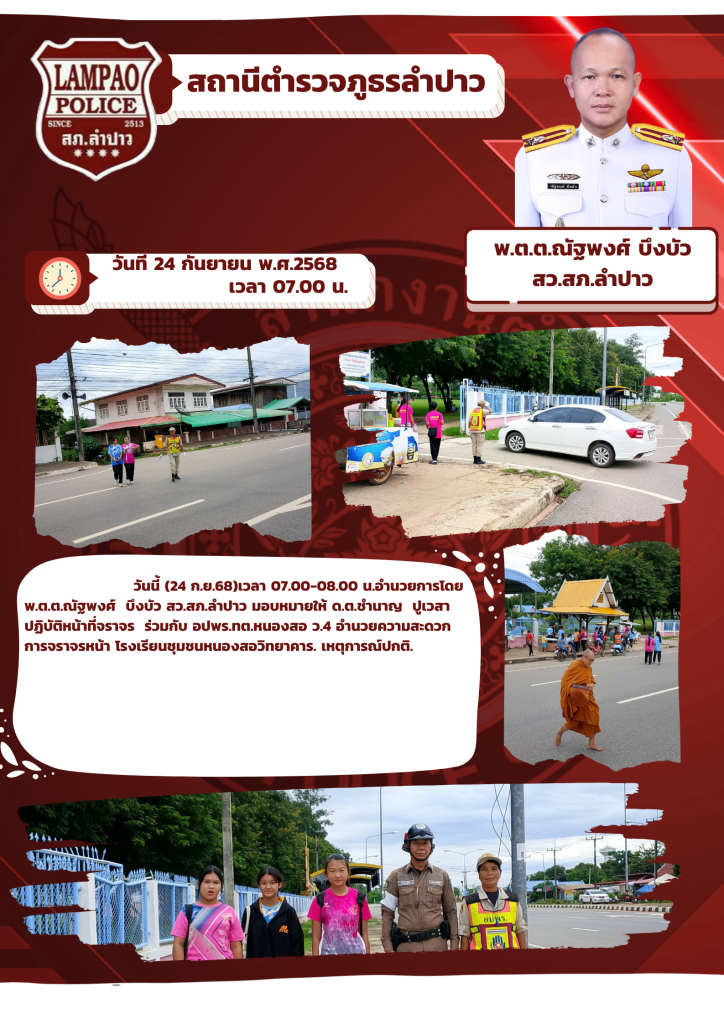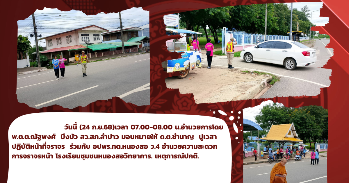 อำนวยความสะดวกจราจรหน้าโรงเรียนชุมชนหนองสอ 24 ก.ย. 2568 24 กันยายน 2568 โดย admlumpao / งานจราจร วันนี้ (24 ก.ย.68)เวลา 07.00-08.00 น.อำนวยการโดย พ.ต.ต.ณัฐพงศ์ บึงบัว สว.สภ.ลำปาว มอบหมายให้ ด.ต.ชำนาญ ปูเวสา ปฏิบัติหน้าที่จราจร ร่วมกับ อปพร.ทต.หนองสอ ว.4 อำนวยความสะดวกการจราจรหน้า โรงเรียนชุมชนหนองสอวิทยาคาร. เหตุการณ์ปกติ. https://www.facebook.com/share/p/1EyFgxebbE/ FacebookFacebookXXLINELine