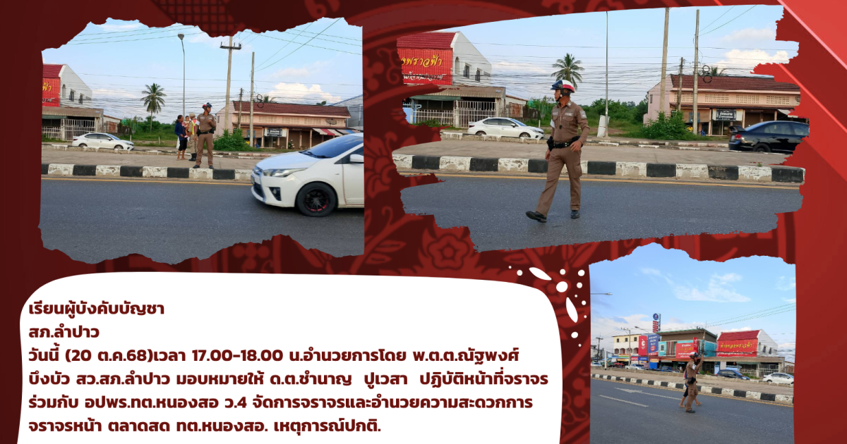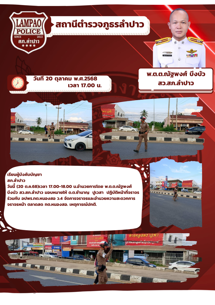 วันนี้ (20 ต.ค.68)เวลา 17.00-18.00 น.อำนวยการโดย พ.ต.ต.ณัฐพงศ์ บึงบัว สว.สภ.ลำปาว มอบหมายให้ ด.ต.ชำนาญ ปูเวสา ปฏิบัติหน้าที่จราจร ร่วมกับ อปพร.ทต.หนองสอ ว.4 จัดการจราจรและอำนวยความสะดวกการจราจรหน้า ตลาดสด ทต.หนองสอ. เหตุการณ์ปกติ.