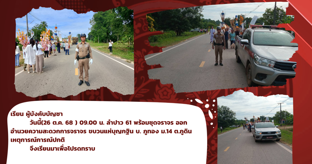 อำนวยความสะดวกจราจร 26 ต.ค. 2568 26 ตุลาคม 2568 โดย admlumpao / งานจราจร,งานป้องกันและปราบปราม รียน ผู้บังคับบัญชา วันนี้(26 ต.ค. 68 ) 09.00 น. ลำปาว 61 พร้อมชุดจราจร ออกอำนวยความสะดวกการจราจร ขบวนแห่บุญกฐิน บ. ภูทอง ม.14 ต.ภูดิน เหตุการณ์การณ์ปกติ จึงเรียนมาเพื่อโปรดทราบ FacebookFacebookXXLINELine