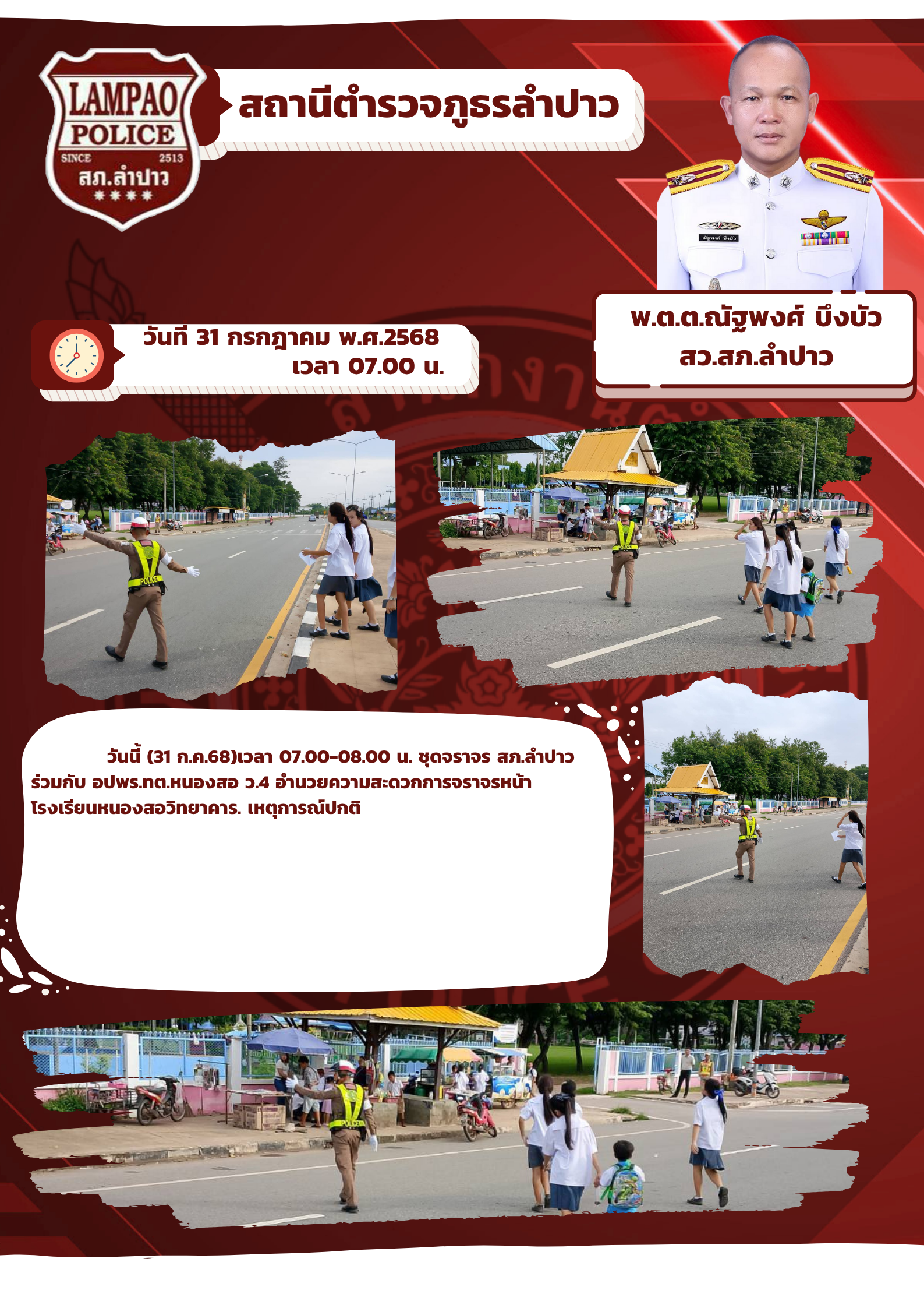 วันนี้ (31 ก.ค.68)เวลา 07.00-08.00 น. ชุดจราจร สภ.ลำปาว ร่วมกับ อปพร.ทต.หนองสอ ว.4 อำนวยความสะดวกการ