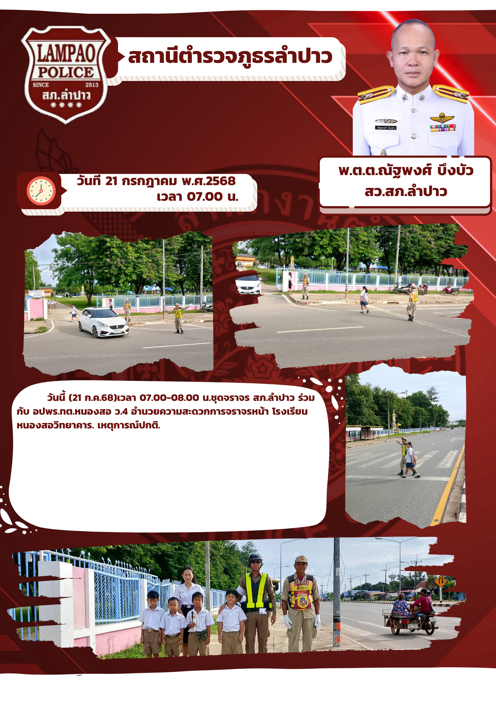 วันนี้ (21 ก.ค.68)เวลา 07.00-08.00 น.ชุดจราจร สภ.ลำปาว ร่วมกับ อปพร.ทต.หนองสอ ว.4 อำนวยความสะดวกการจ