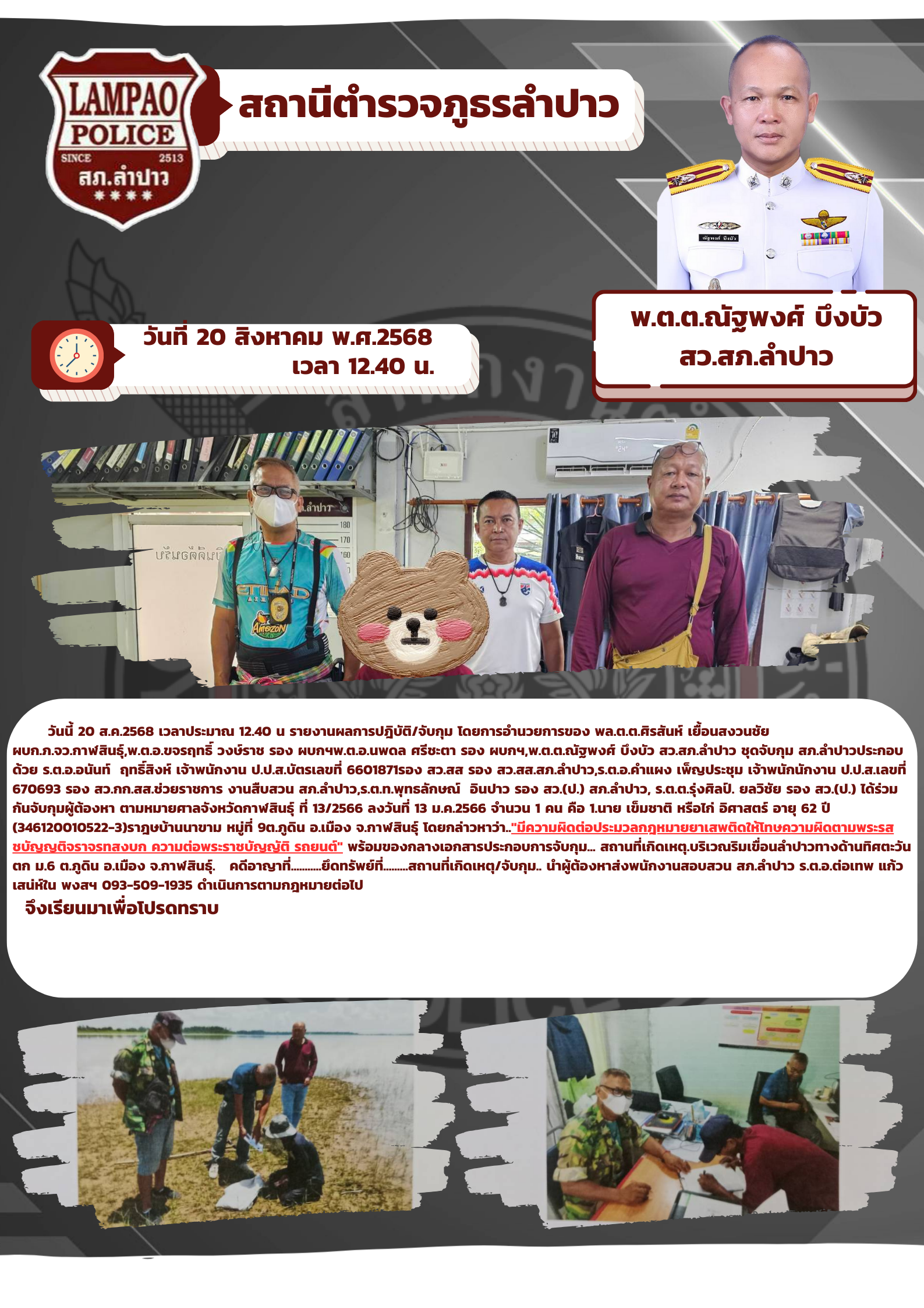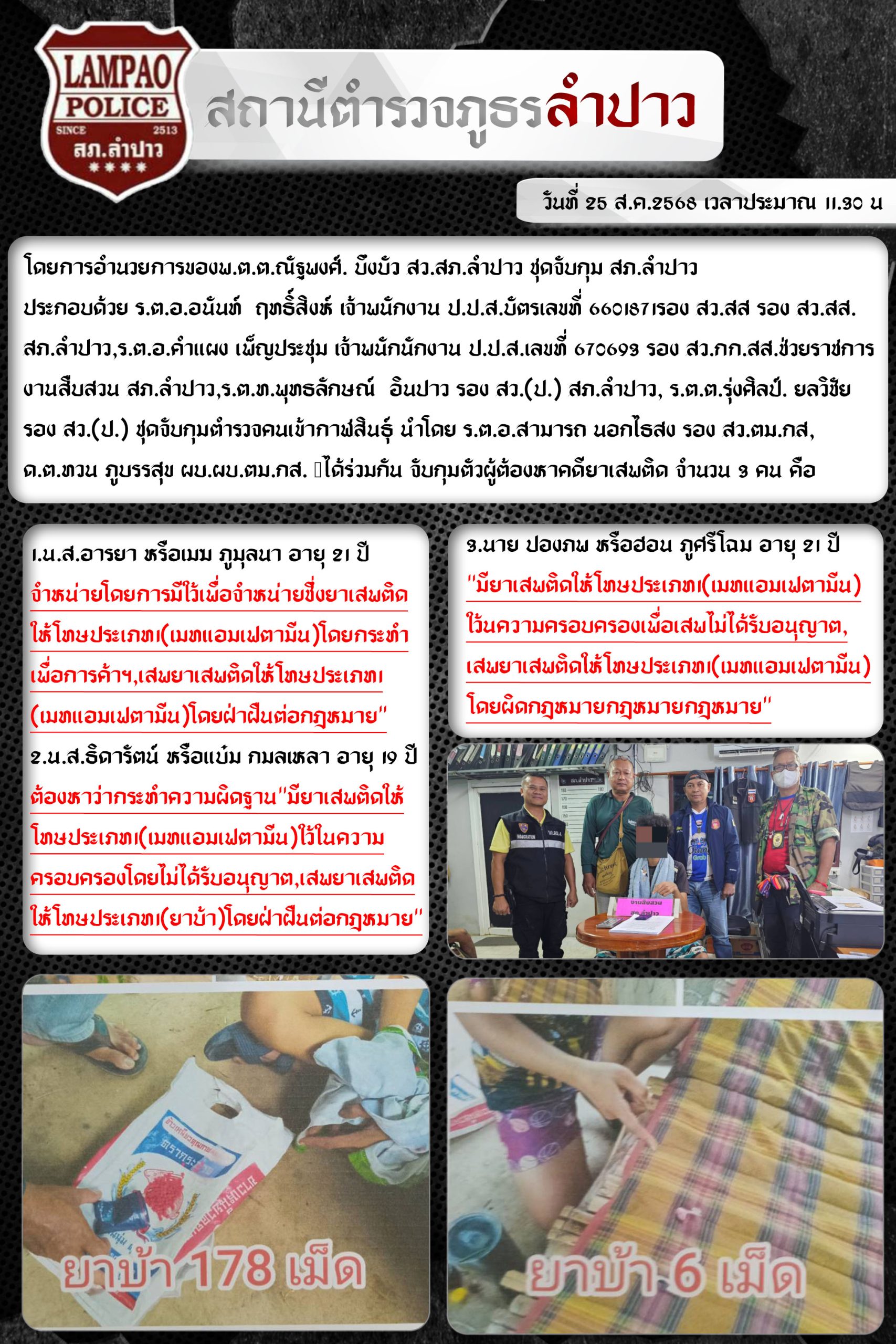 วันที่ 25 ส.ค.2568 เวลาประมาณ 11.30 น โดยการอำนวยการของพ.ต.ต.ณัฐพงศ์. บึงบัว สว.สภ.ลำปาว ชุดจับกุม ส