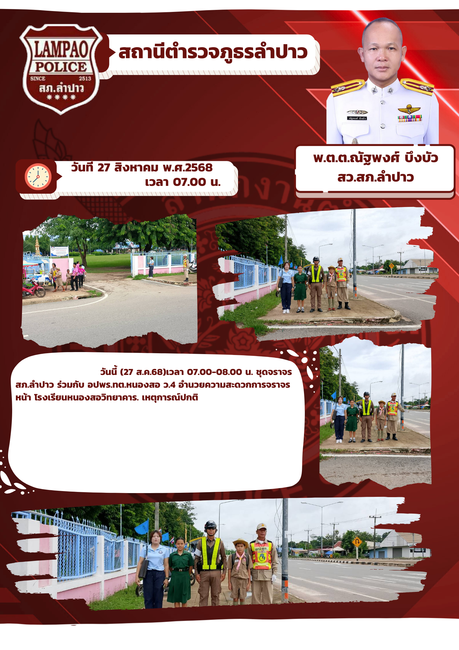 วันนี้ (27 ส.ค.68)เวลา 07.00-08.00 น. ชุดจราจร สภ.ลำปาว ร่วมกับ อปพร.ทต.หนองสอ ว.4 อำนวยความสะดวกการ