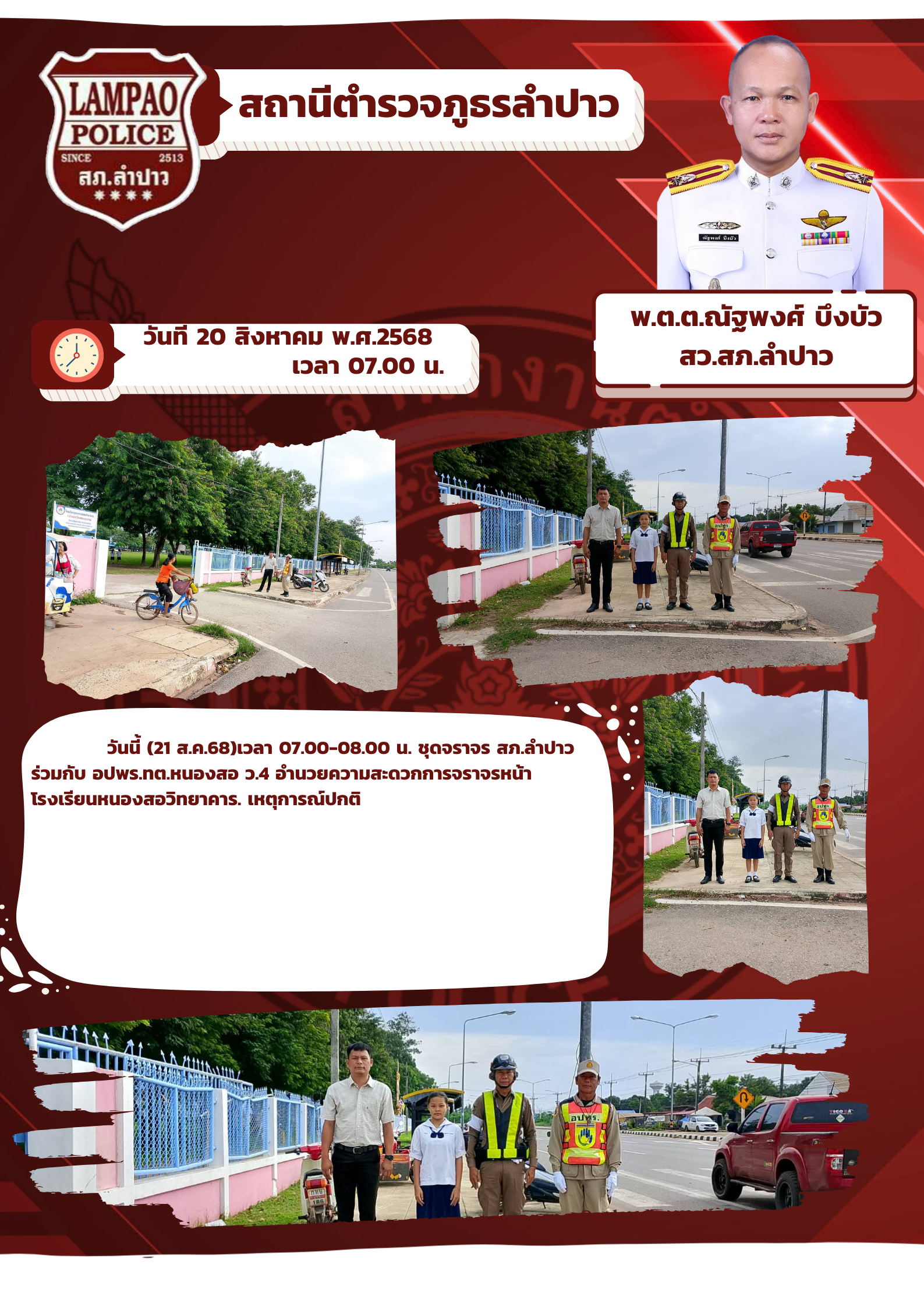 วันนี้ (21 ส.ค.68)เวลา 07.00-08.00 น. ชุดจราจร สภ.ลำปาว ร่วมกับ อปพร.ทต.หนองสอ ว.4 อำนวยความสะดวกการ