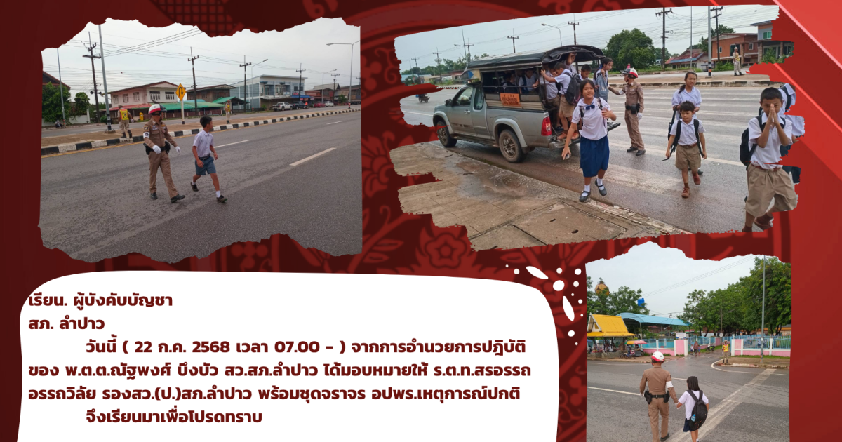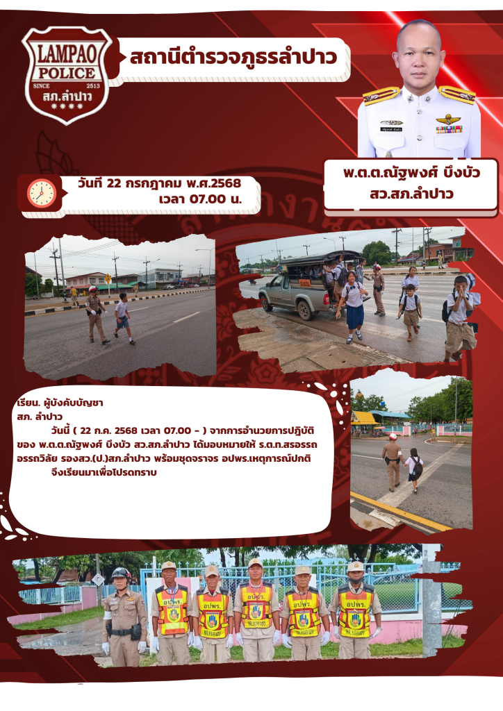 วันนี้ ( 22 ก.ค. 2568 เวลา 07.00 – ) จากการอำนวยการปฎิบัติของ พ.ต.ต.ณัฐพงศ์ บึงบัว สว.สภ.ลำปาว ได้มอบหมายให้ ร.ต.ท.สรอรรถ อรรถวิลัย รองสว.(ป.)สภ.ลำปาว พร้อมชุดจราจร อปพร.เหตุการณ์ปกติ