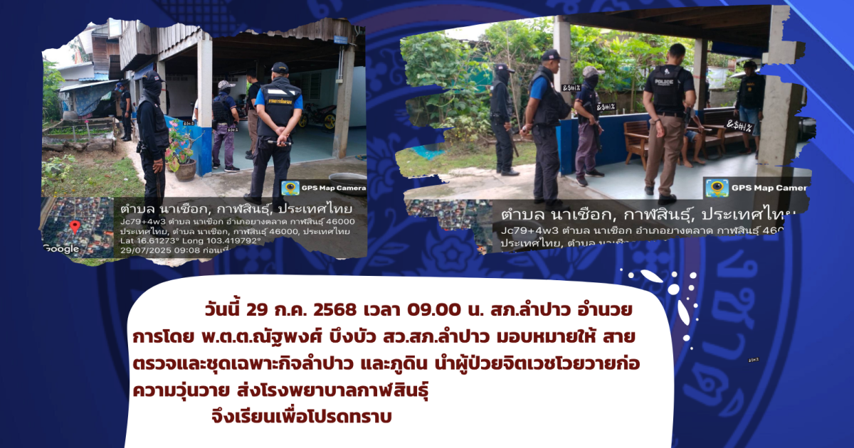 วันนี้ 29 ก.ค. 2568 เวลา 09.00 น. สภ.ลำปาว อำนวยการโดย พ.ต.ต.ณัฐพงศ์ บึงบัว สว.สภ.ลำปาว มอบหมายให้ สายตรวจและชุดเฉพาะกิจลำปาว และภูดิน นำผู้ป่วยจิตเวชโวยวายก่อความวุ่นวาย ส่งโรงพยาบาลกาฬสินธุ์