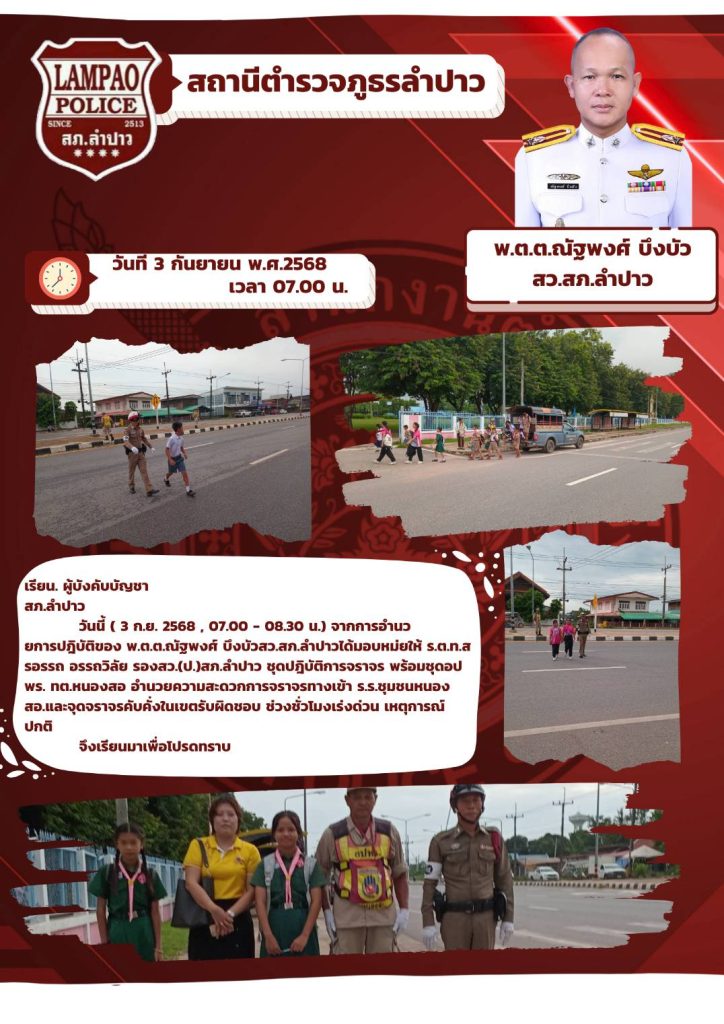 3 กันยายน พ.ศ.2568 3 กันยายน 2568 โดย admlumpao / งานจราจร สภ.ลำปาว วันนี้ ( 3 ก.ย. 2568 , 07.00 – 08.30 น.) จากการอำนวยการปฎิบัติของ พ.ต.ต.ณัฐพงศ์ บึงบัวสว.สภ.ลำปาวได้มอบหม่ยให้ ร.ต.ท.สรอรรถ อรรถวิลัย รองสว.(ป.)สภ.ลำปาว ชุดปฎิบัติการจราจร พร้อมชุดอปพร. ทต.หนองสอ อำนวยความสะดวกการจราจรทางเข้า ร.ร.ชุมชนหนองสอ.และจุดจราจรคับคั่งในเขตรับผิดชอบ ช่วงชั่วโมงเร่งด่วน เหตุการณ์ปกติ https://www.facebook.com/share/p/18HsLuGmaH/ FacebookFacebookXXLINELine