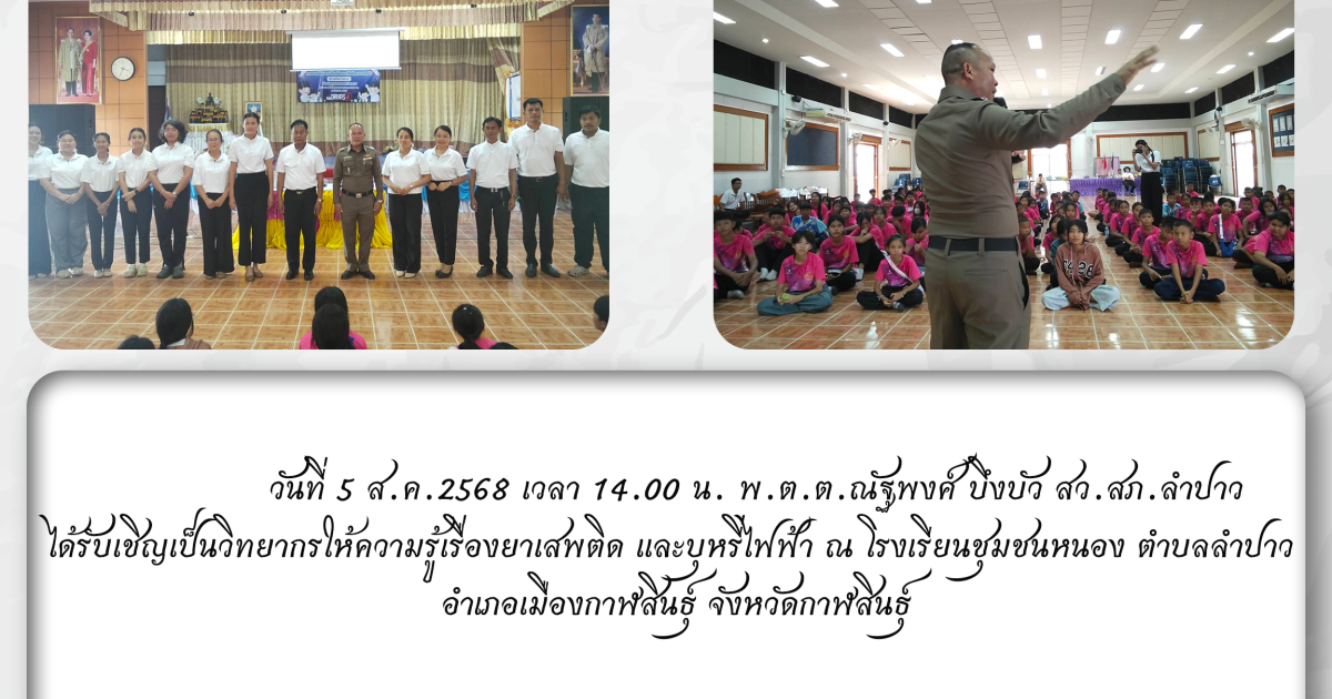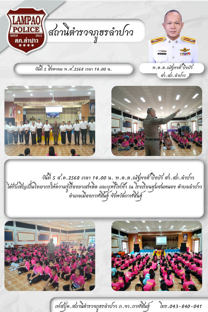 วันที่ 5 ส.ค.2568 เวลา 14.00 น. พ.ต.ต.ณัฐพงศ์ บึงบัว สว.สภ.ลำปาว ได้รับเชิญเป็นวิทยากรให้ความรู้เรื่องยาเสพติด และบุหรี่ไฟฟ้า ณ โรงเรียนชุมชนหนอง ตำบลลำปาว อำเภอเมืองกาฬสินธุ์ จังหวัดกาฬสินธุ์ https://www.facebook.com/share/p/19brBFzpNC/