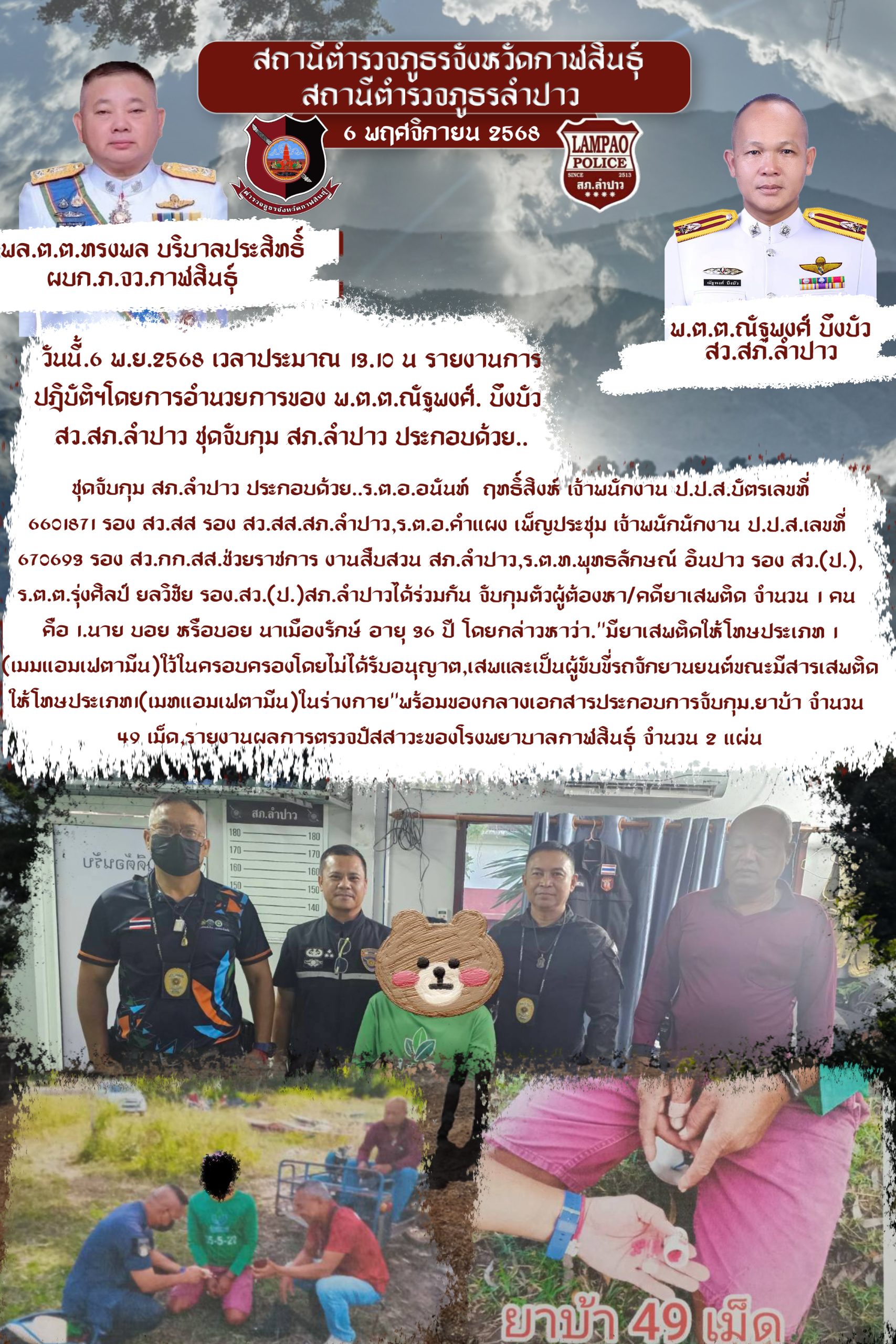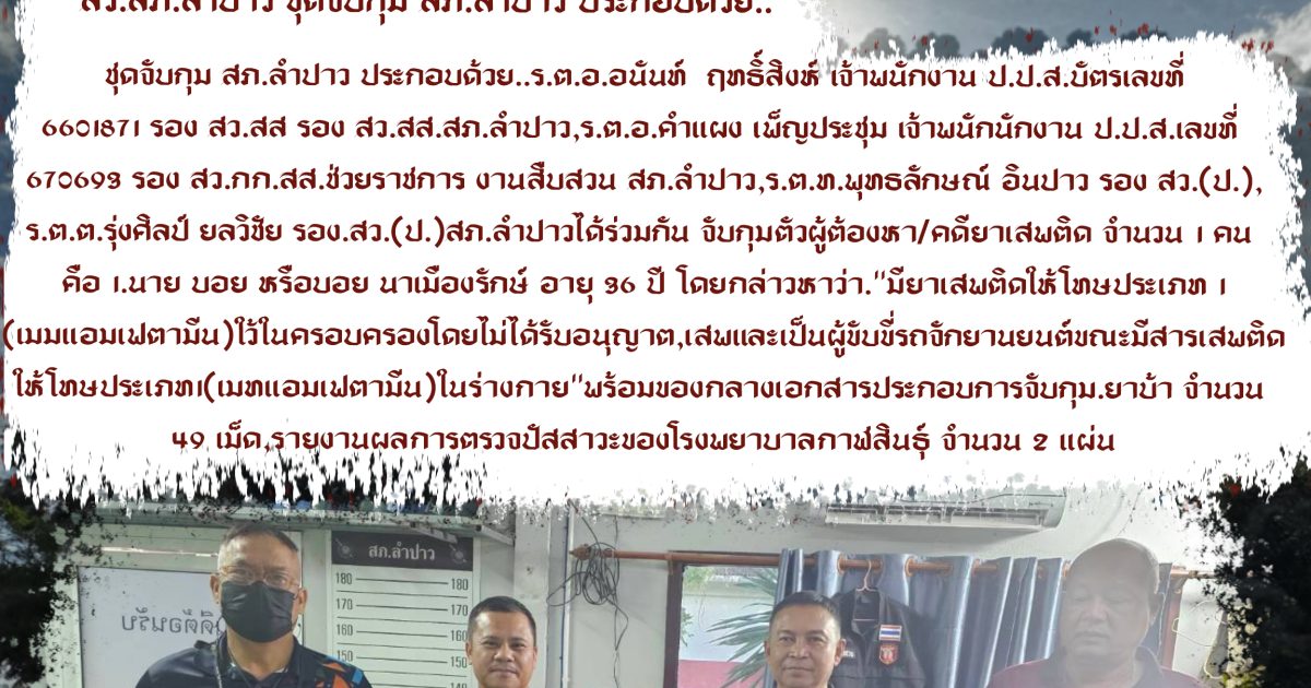 👮 ชุดจับกุม สภ.ลำปาว ประกอบด้วย..ร.ต.อ.อนันท์ ฤทธิ์สิงห์ เจ้าพนักงาน ป.ป.ส.บัตรเลขที่ 6601871 รอง สว.สส รอง สว.สส.สภ.ลำปาว,ร.ต.อ.คำแผง เพ็ญประชุม เจ้าพนักนักงาน ป.ป.ส.เลขที่ 670693 รอง สว.กก.สส.ช่วยราชการ งานสืบสวน สภ.ลำปาว,ร.ต.ท.พุทธลักษณ์ อินปาว รอง สว.(ป.),ร.ต.ต.รุ่งศิลป์ ยลวิชัย รอง.สว.(ป.)สภ.ลำปาว 🔗ได้ร่วมกัน จับกุมตัวผู้ต้องหา/คดียาเสพติด จำนวน 1 คน คือ