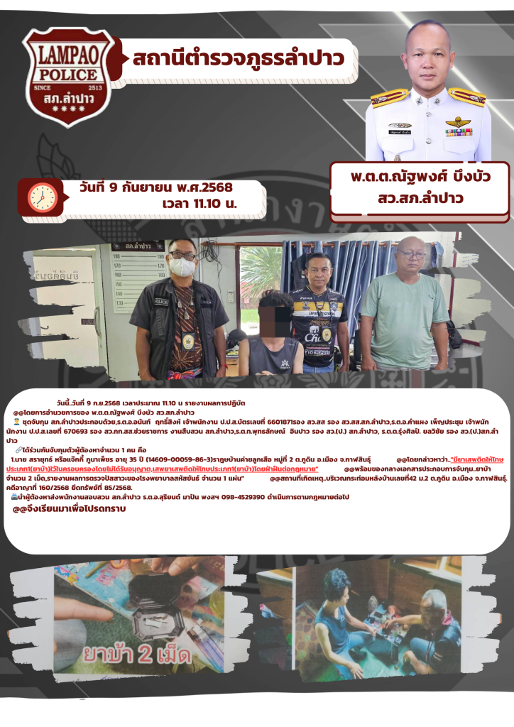 👮 ชุดจับกุม สภ.ลำปาวประกอบด้วย,ร.ต.อ.อนันท์ ฤทธิ์สิงห์ เจ้าพนักงาน ป.ป.ส.บัตรเลขที่ 6601871รอง สว.สส รอง สว.สส.สภ.ลำปาว,ร.ต.อ.คำแผง เพ็ญประชุม เจ้าพนักนักงาน ป.ป.ส.เลขที่ 670693 รอง สว.กก.สส.ช่วยราชการ งานสืบสวน สภ.ลำปาว,ร.ต.ท.พุทธลักษณ์ อินปาว รอง สว.(ป.) สภ.ลำปาว, ร.ต.ต.รุ่งศิลป์. ยลวิชัย รอง สว.(ป.)สภ.ลำปาว