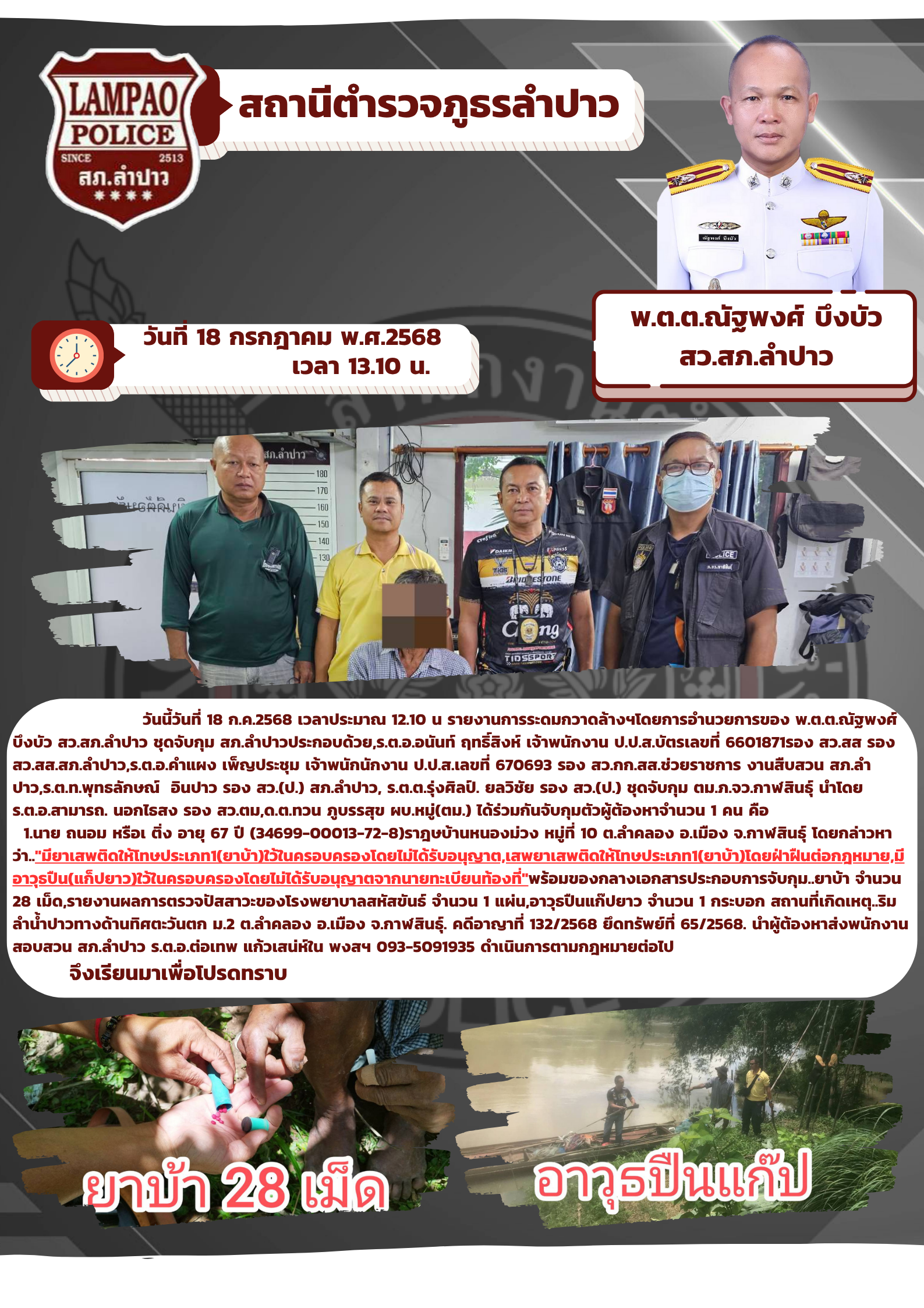 วันที่ 25 ส.ค.2568 เวลาประมาณ 11.30 น โดยการอำนวยการของพ.ต.ต.ณัฐพงศ์. บึงบัว สว.สภ.ลำปาว ชุดจับกุม ส