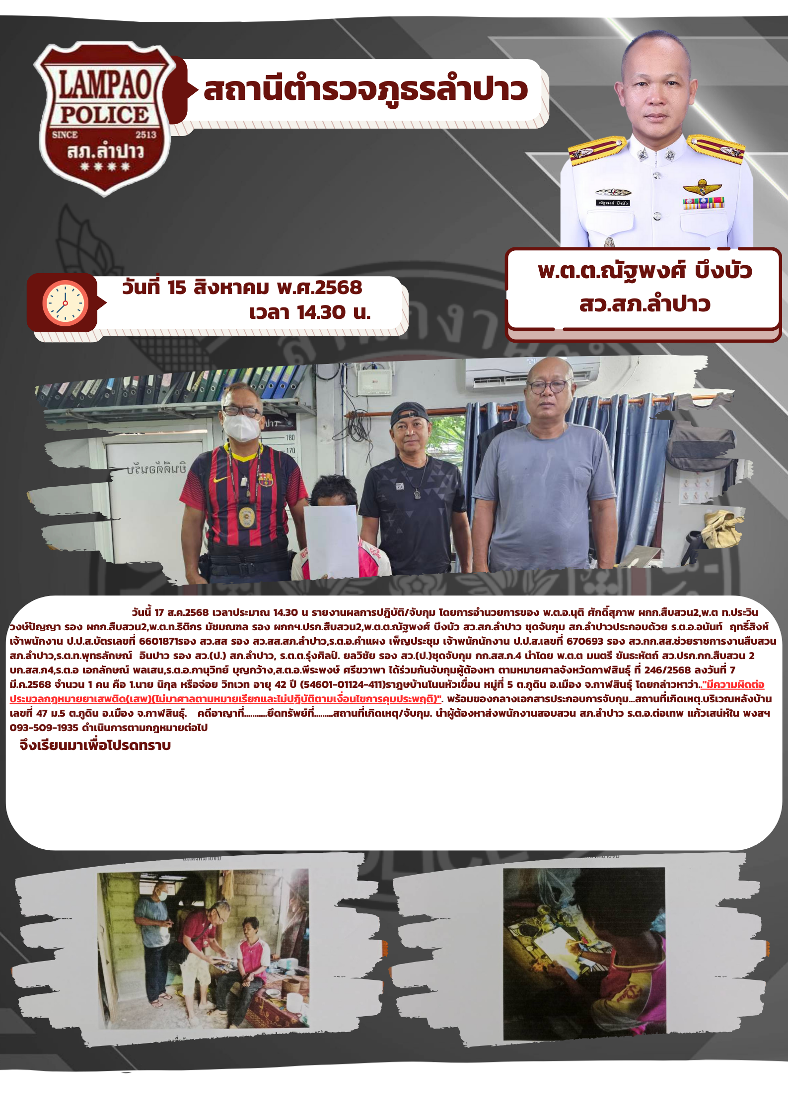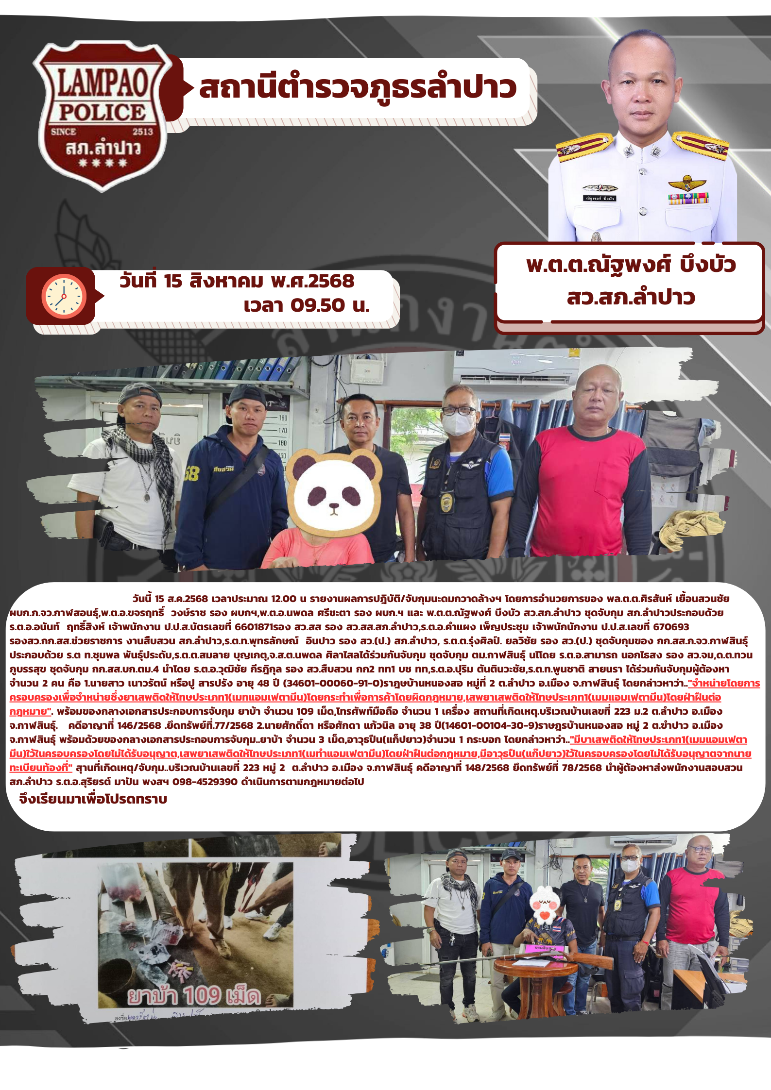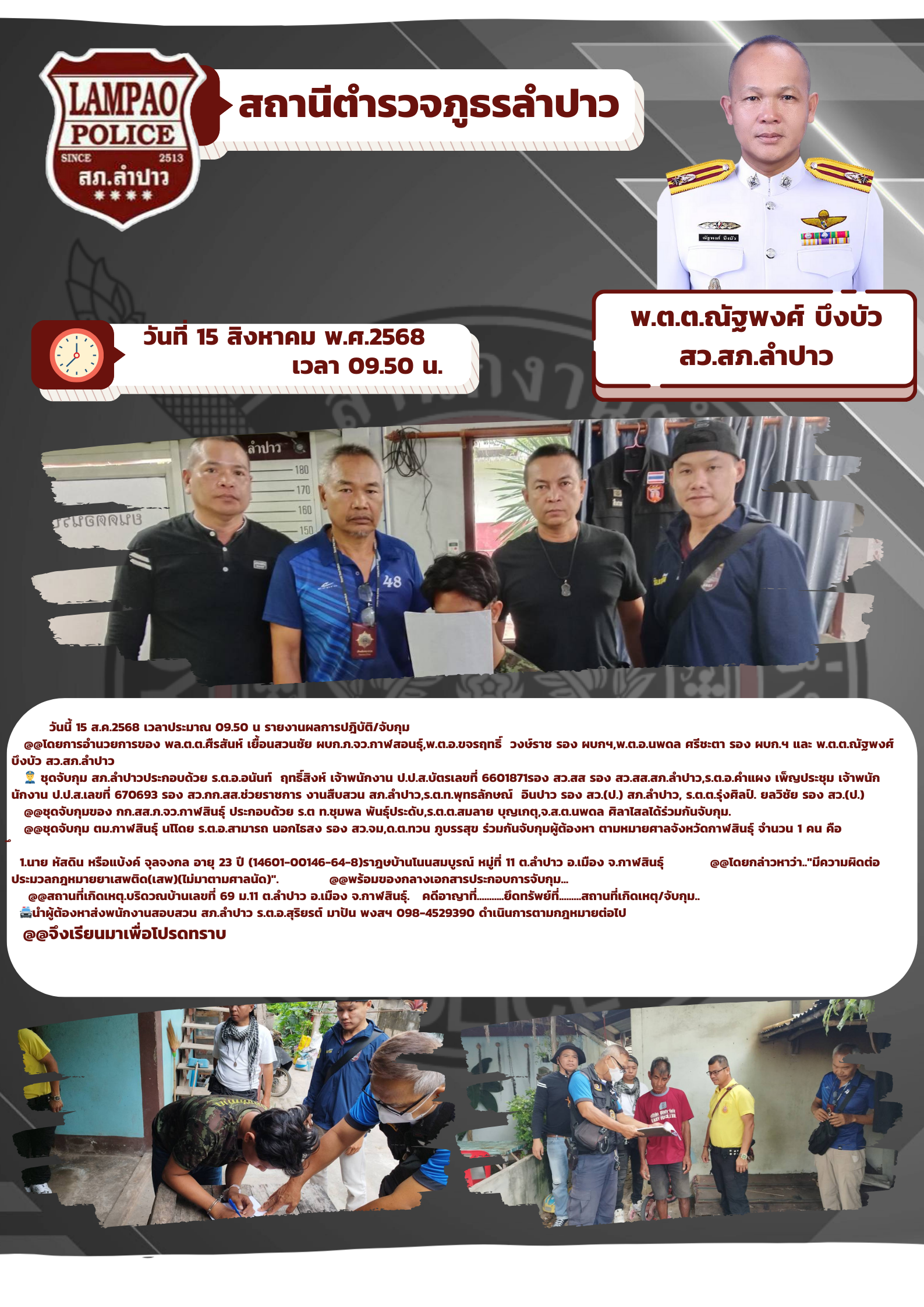 วันนี้ 15 ส.ค.2568 เวลาประมาณ 09.50 น รายงานผลการปฎิบัติ/จับกุม โดยการอำนวยการของ พล.ต.ต.ศืรสันห์ เย