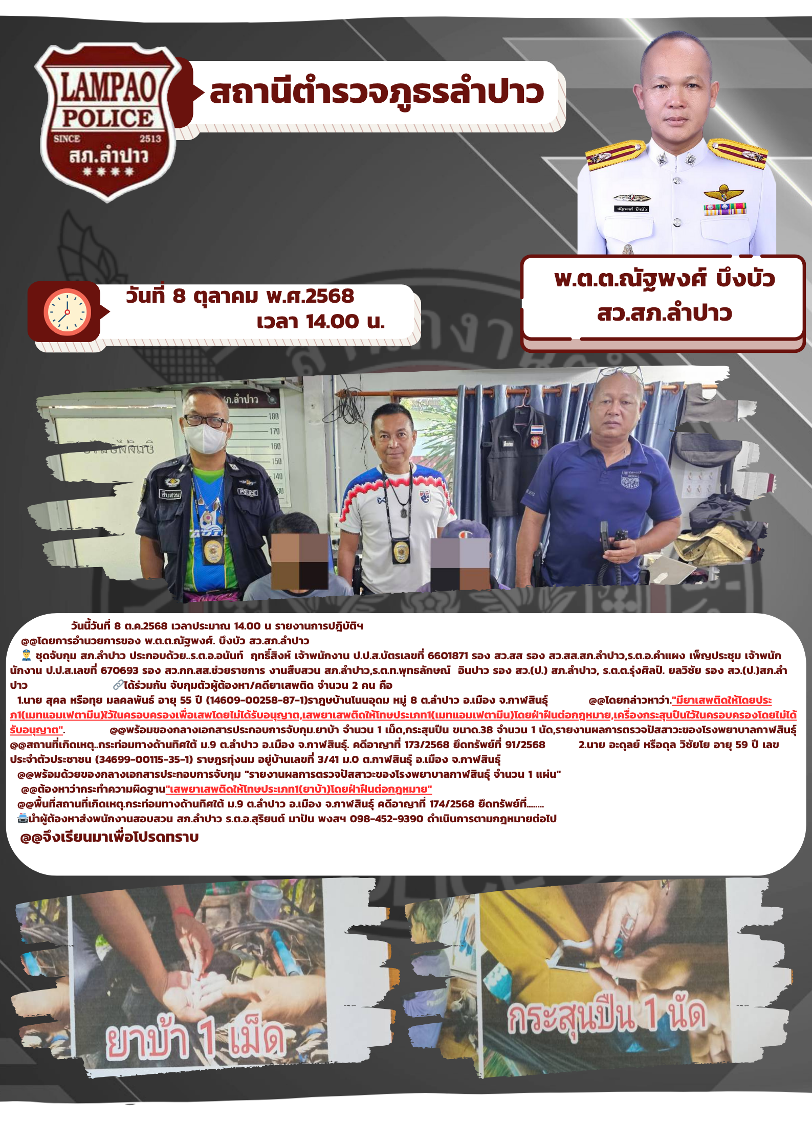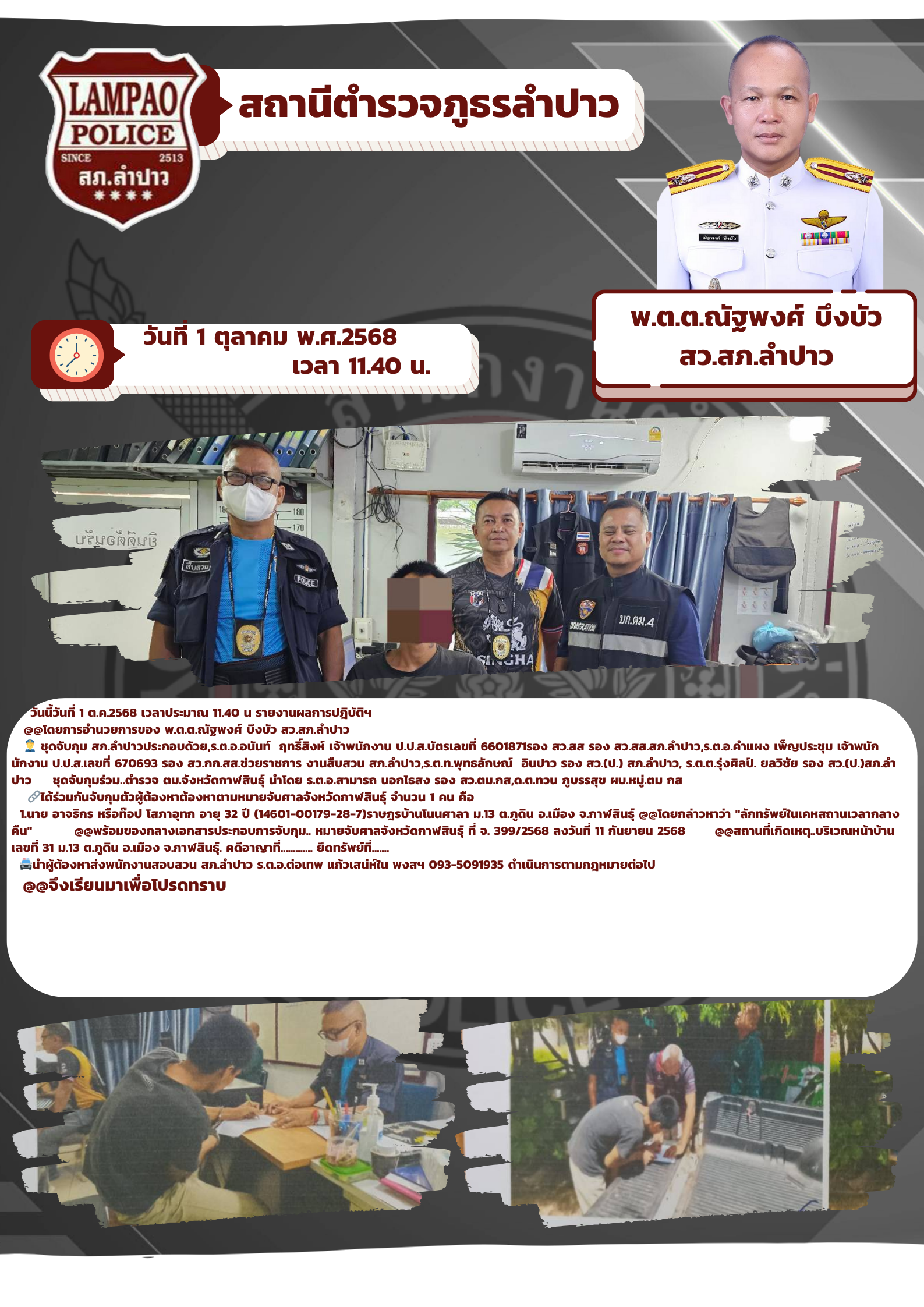 วันนี้วันที่ 1 ต.ค.2568 เวลาประมาณ 11.40 น รายงานผลการปฎิบัติฯ @@โดยการอำนวยการของ พ.ต.ต.ณัฐพงศ์ บึง