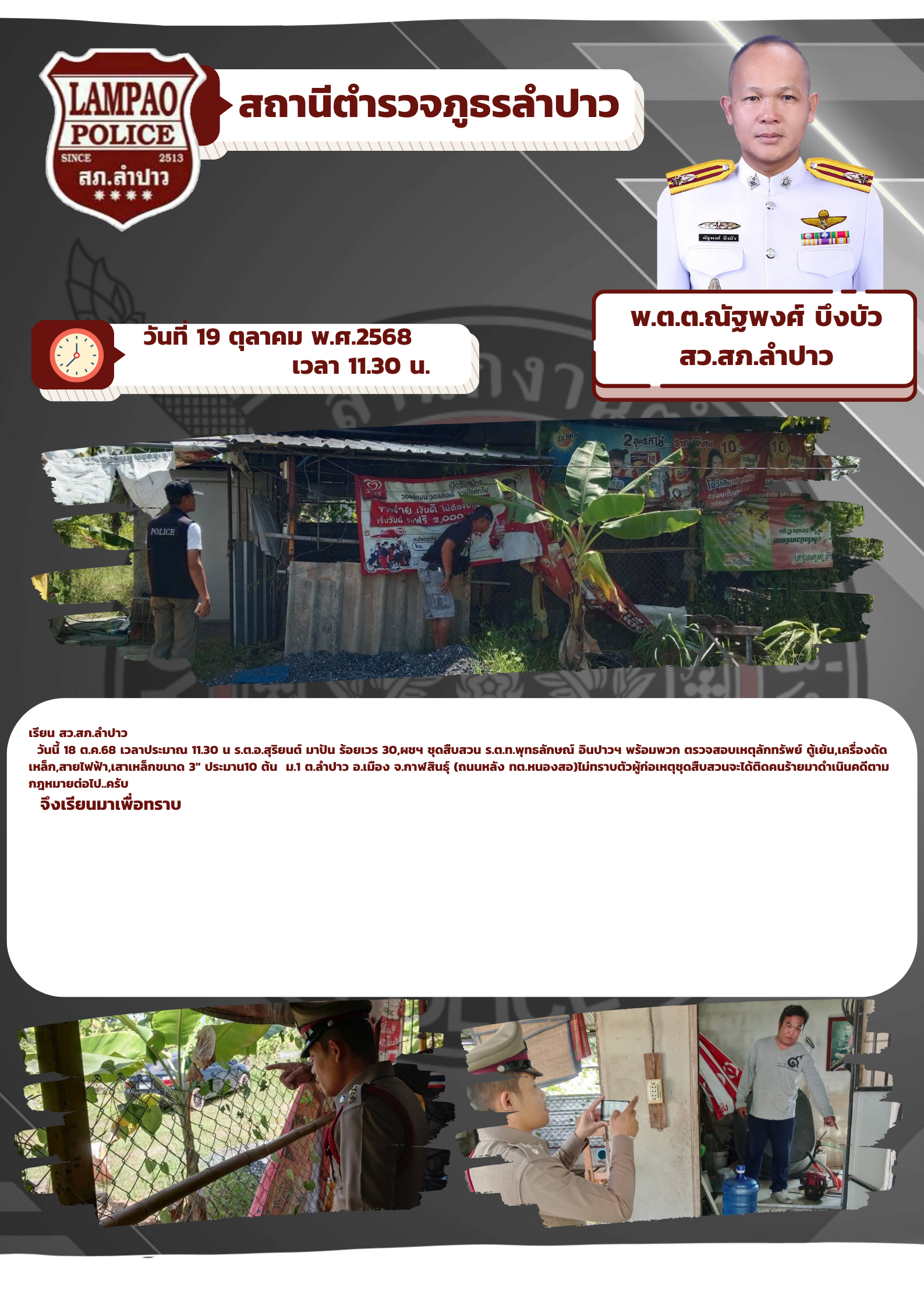 เรียน สว.สภ.ลำปาว วันนี้ 18 ต.ค.68 เวลาประมาณ 11.30 น ร.ต.อ.สุริยนต์ มาปัน ร้อยเวร 30,ผชฯ ชุดสืบสวน