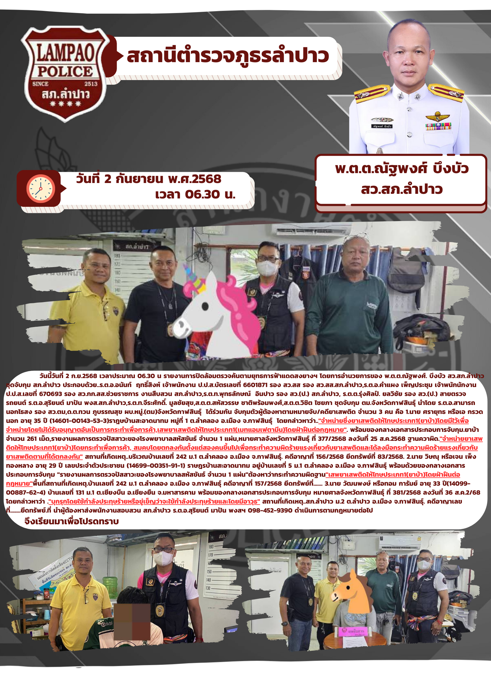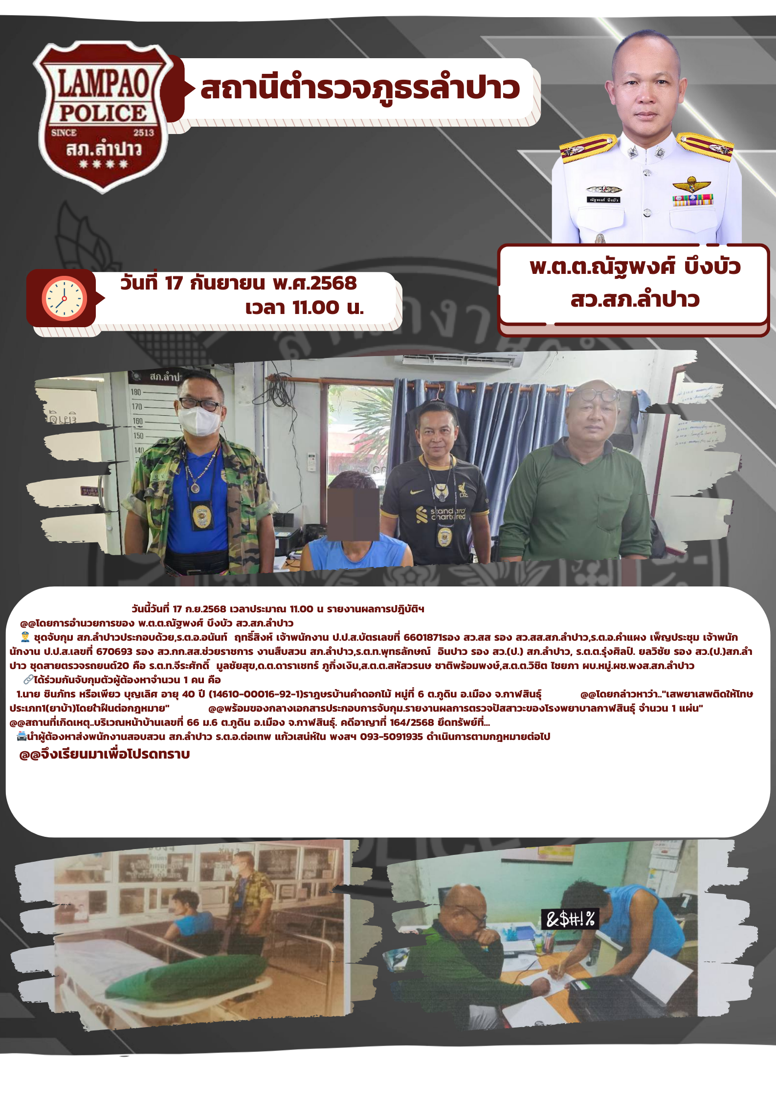 วันนี้ 1 กย.2568 เวลาประมาณ 12.20 น รายงานผลการปฎิบัติ/จับกุม โดยการอำนวยการของ พ.ต.ต.ณัฐพงศ์