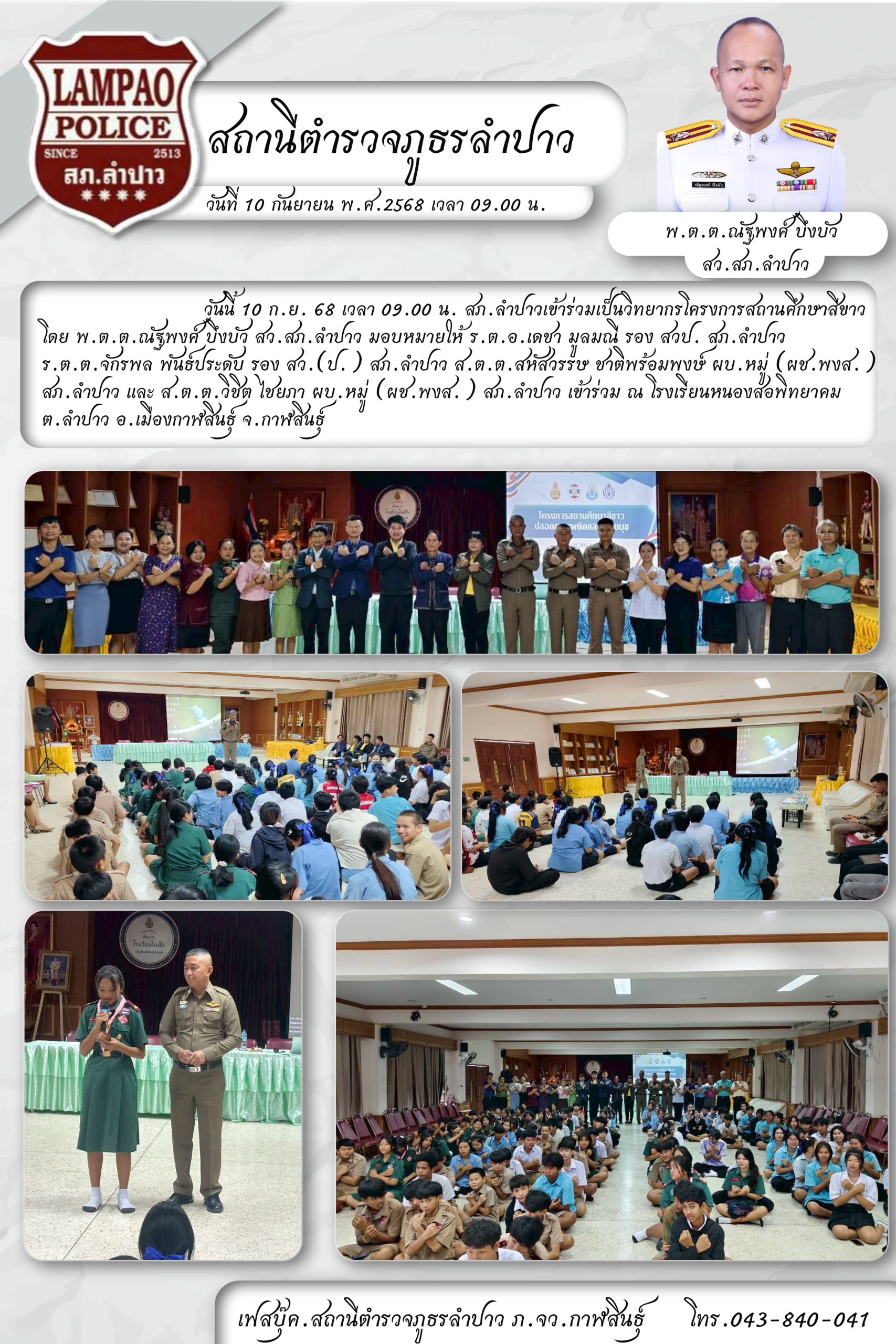 วันนี้ 10 ก.ย. 68 เวลา 09.00 น. สภ.ลำปาวเข้าร่วมเป็นวิทยากรโครงการสถานศึกษาสีขาว โดย พ.ต.ต.ณัฐพงศ์ บ