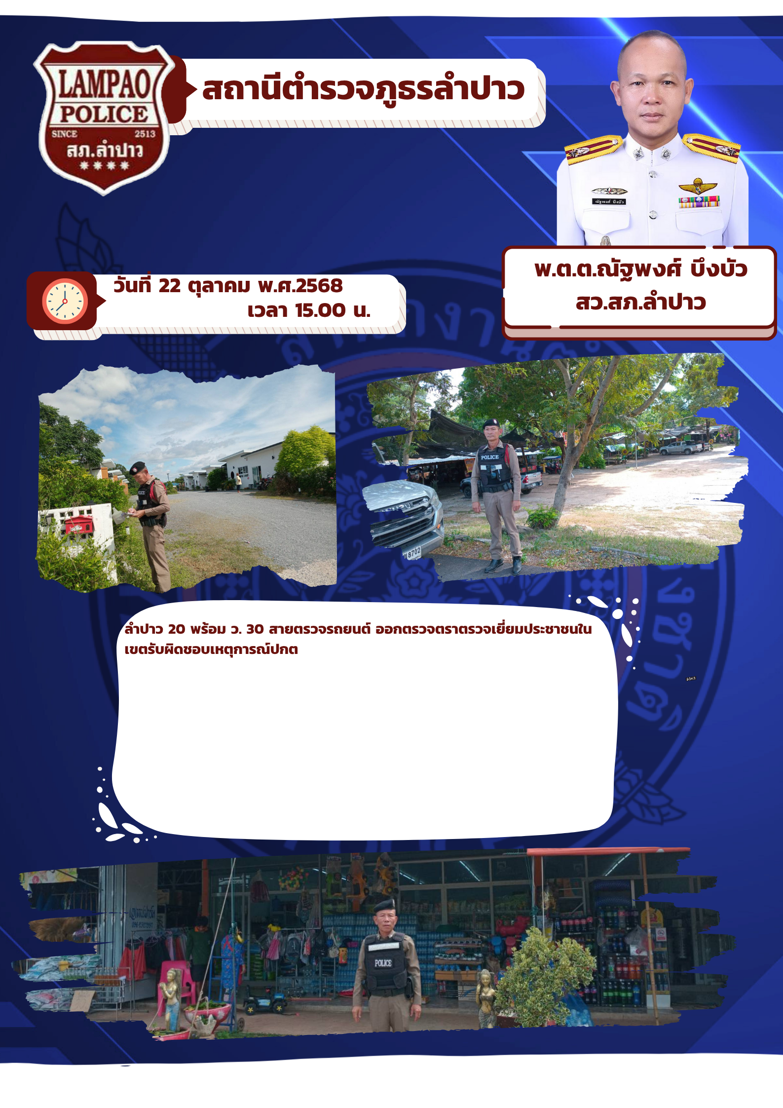 ลำปาว 20 พร้อม ว. 30 สายตรวจรถยนต์ ออกตรวจตราตรวจเยี่ยมประชาชนในเขตรับผิดชอบเหตุการณ์ปกต